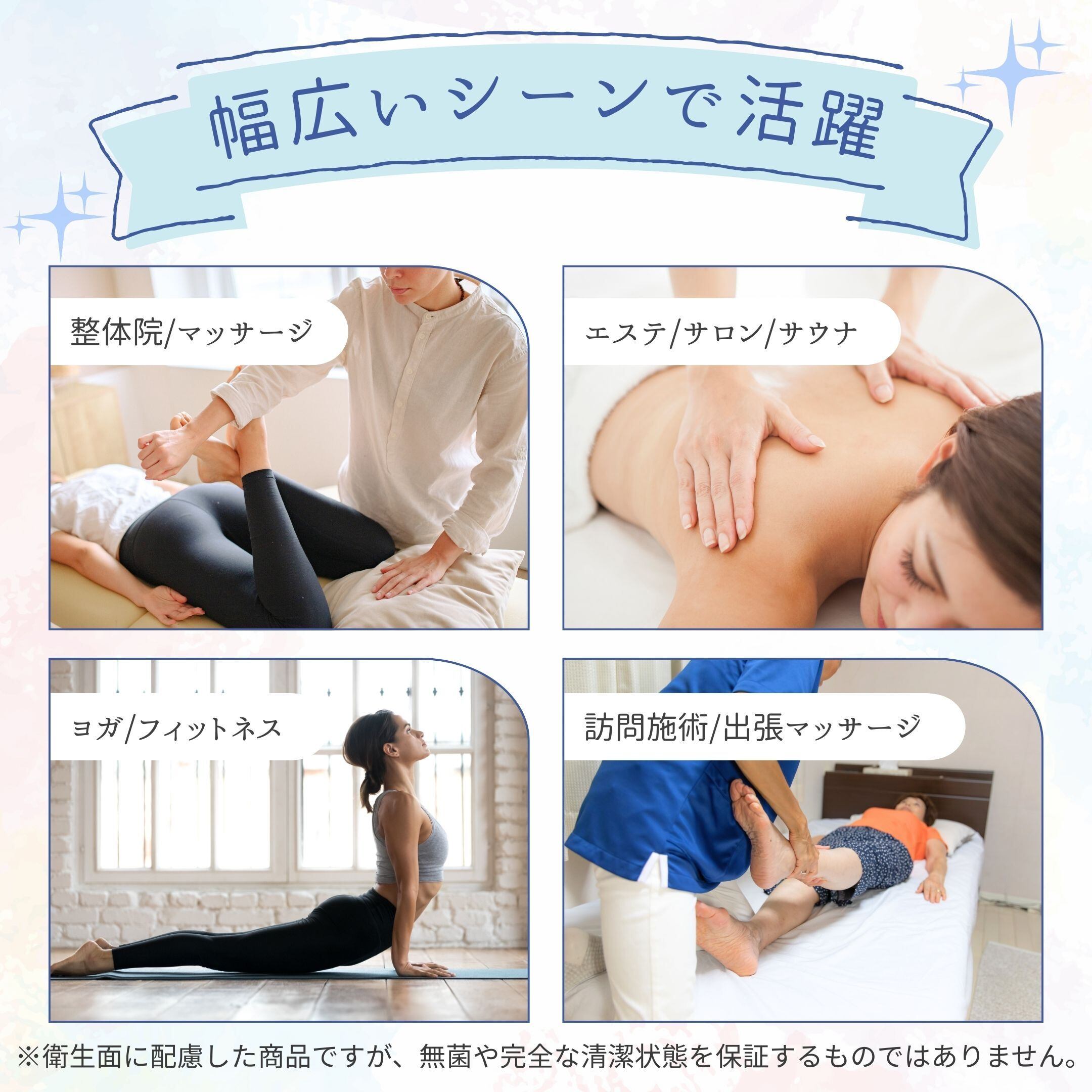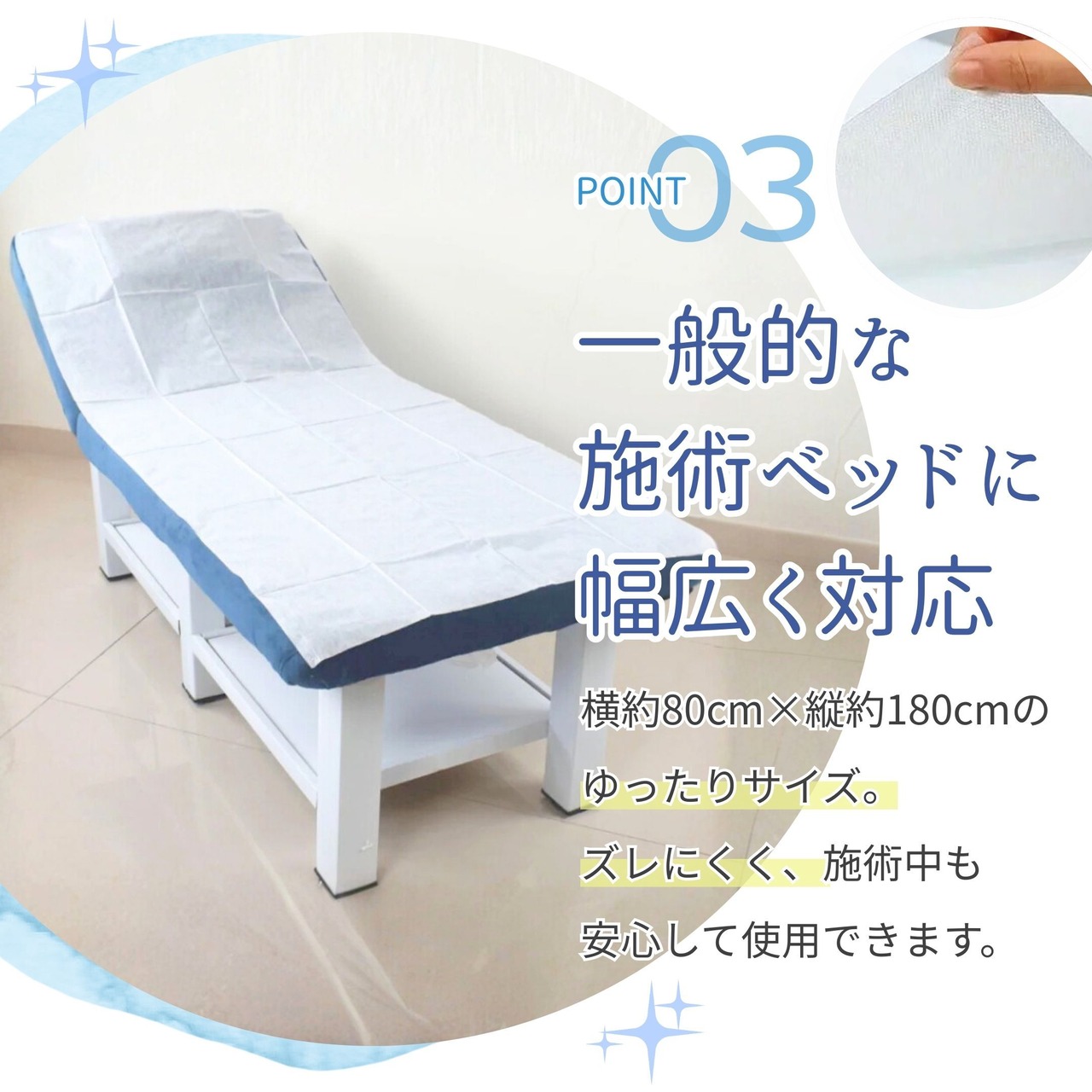 ゆったりサイズで 一般的な施術ベッドや簡易ベッドにも対応。