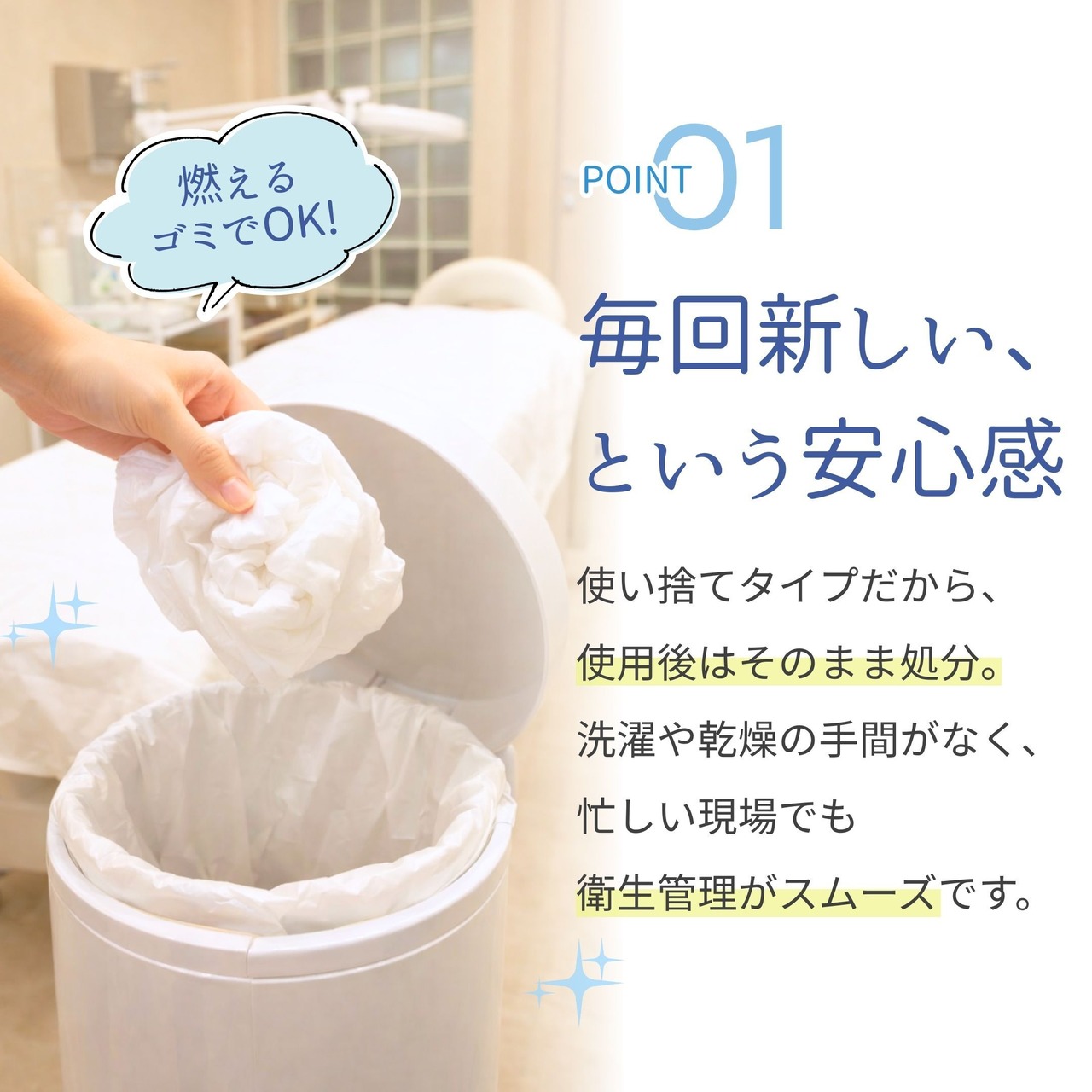 使い捨てタイプのため、洗濯の手間がなく、使用後はそのまま処分でき 衛生管理がしやすい点が特徴です。