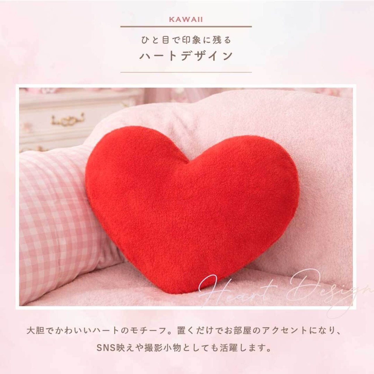 大きめサイズで存在感のある、ハート型のクッション。