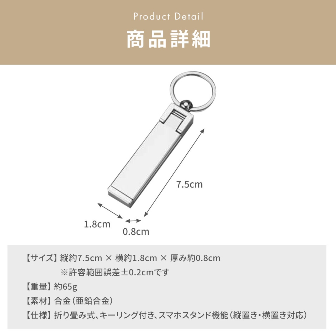 ・仕様:折り畳み式、キーリング付き、スマホスタンド機能(縦置き・横置き対応)
