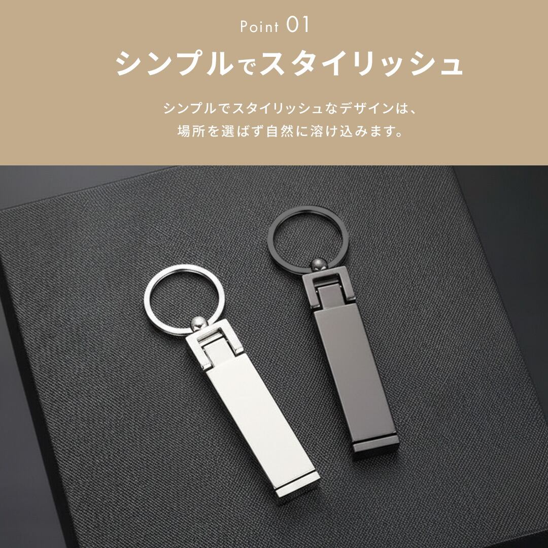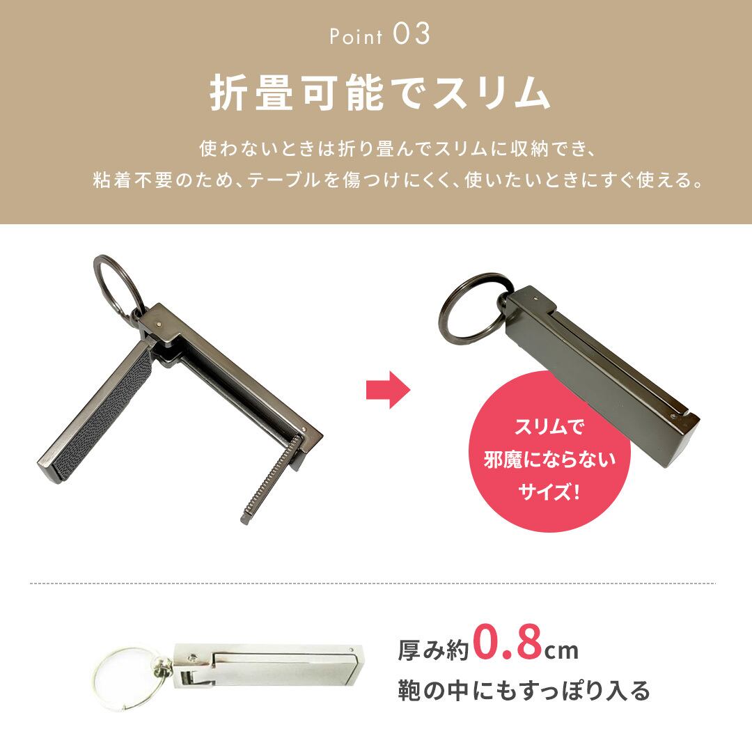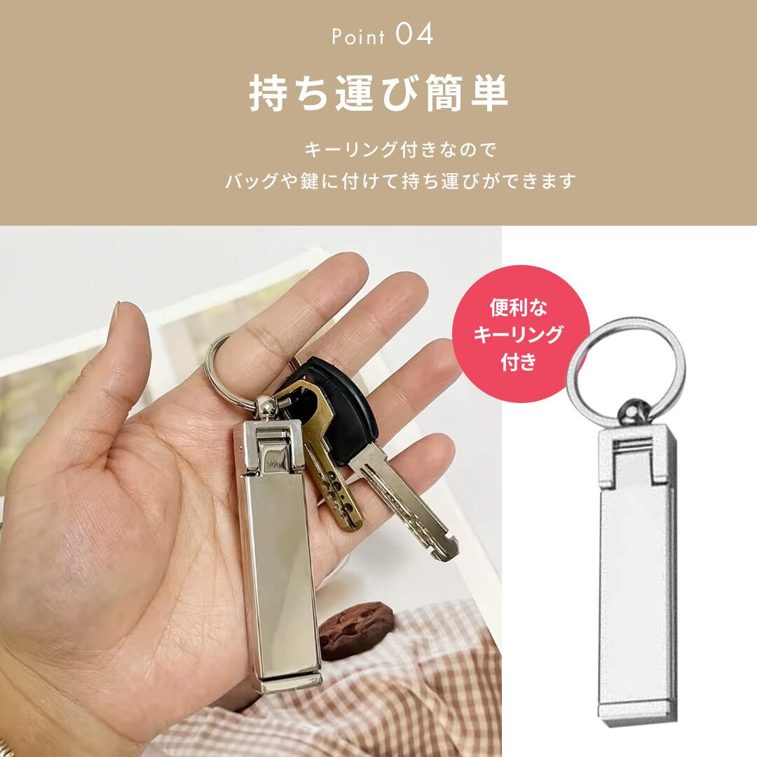 使わないときは折り畳んでスリムに収納でき、キーリング付きなのでバッグや鍵に付けて持ち運びができます。