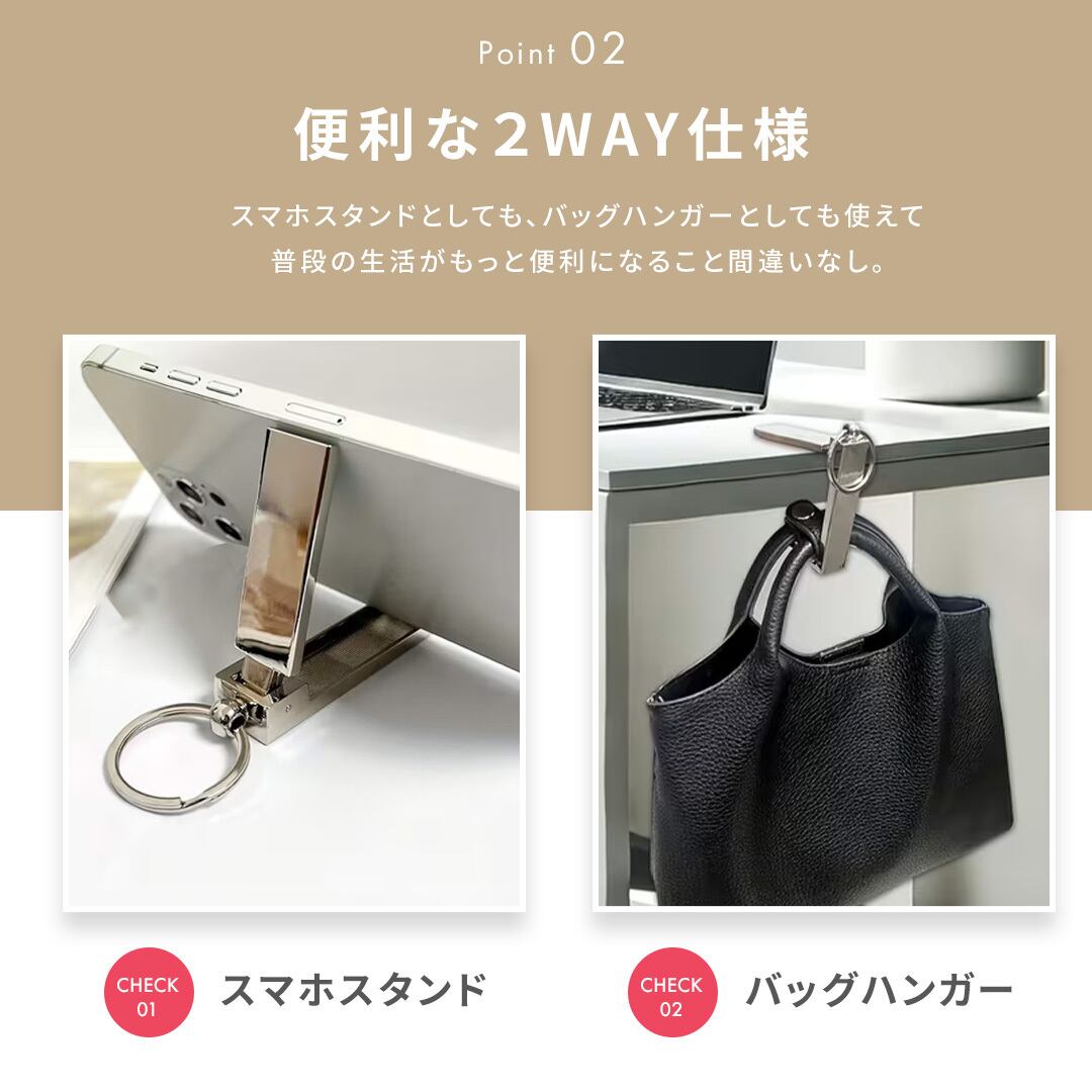 【普通郵便発送】 2WAYバッグハンガー 全2カラー スマホスタンド テーブルフック バッグフック 鞄掛け 荷物掛け デスクフック バッグホルダー 折りたたみ コンパクト 軽量 携帯用 キーホルダー付き おしゃれ シンプル スタイリッシュ 男女兼用 バッグアクセサリー オフィス カフェ 通勤 通学 外出 旅行 デスクワーク スマホ置き 縦置き 横置き 粘着不要 吊り下げ 省スペース 多機能 実用的 便利グッズ 日常使い 持ち運び便利 バッグ整理 衛生的 床置き防止 プレゼント ギフト 誕生日 新生活 人気 使いやすい コンパクト設計 携帯アクセサリー テーブルハンガー バッグ掛けホルダー スマホホルダー キーリング付き 金属製 スリム 小型