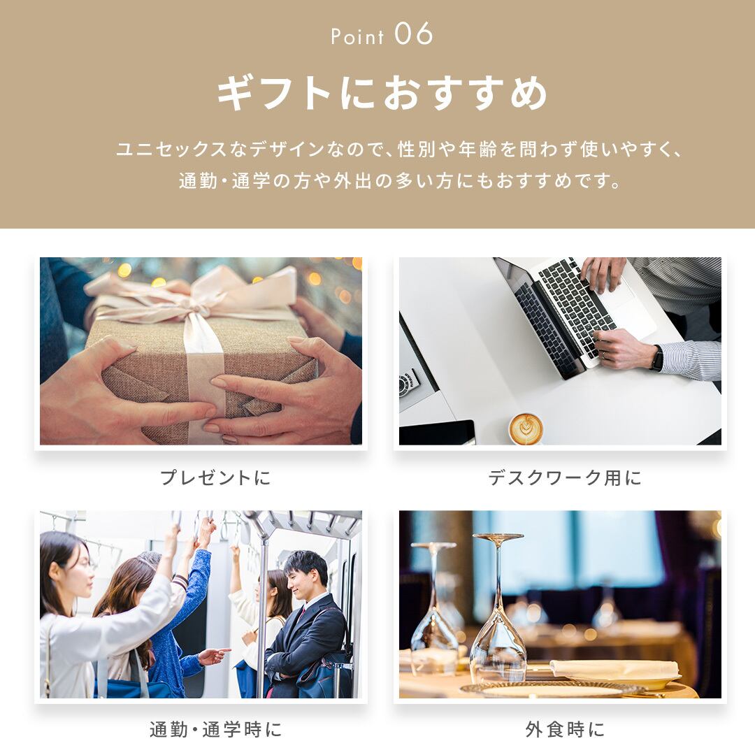 ユニセックスなデザインなので、性別や年齢を問わず使いやすく、通勤・通学の方や外出の多い方にもおすすめです。