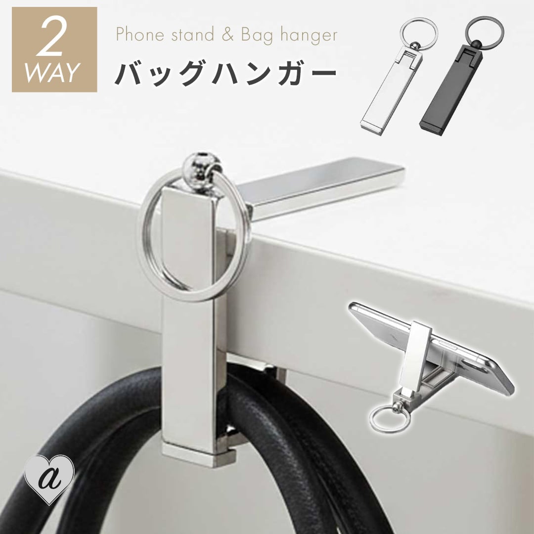 【普通郵便発送】 2WAYバッグハンガー 全2カラー スマホスタンド テーブルフック バッグフック 鞄掛け 荷物掛け デスクフック バッグホルダー 折りたたみ コンパクト 軽量 携帯用 キーホルダー付き おしゃれ シンプル スタイリッシュ 男女兼用 オフィス カフェ