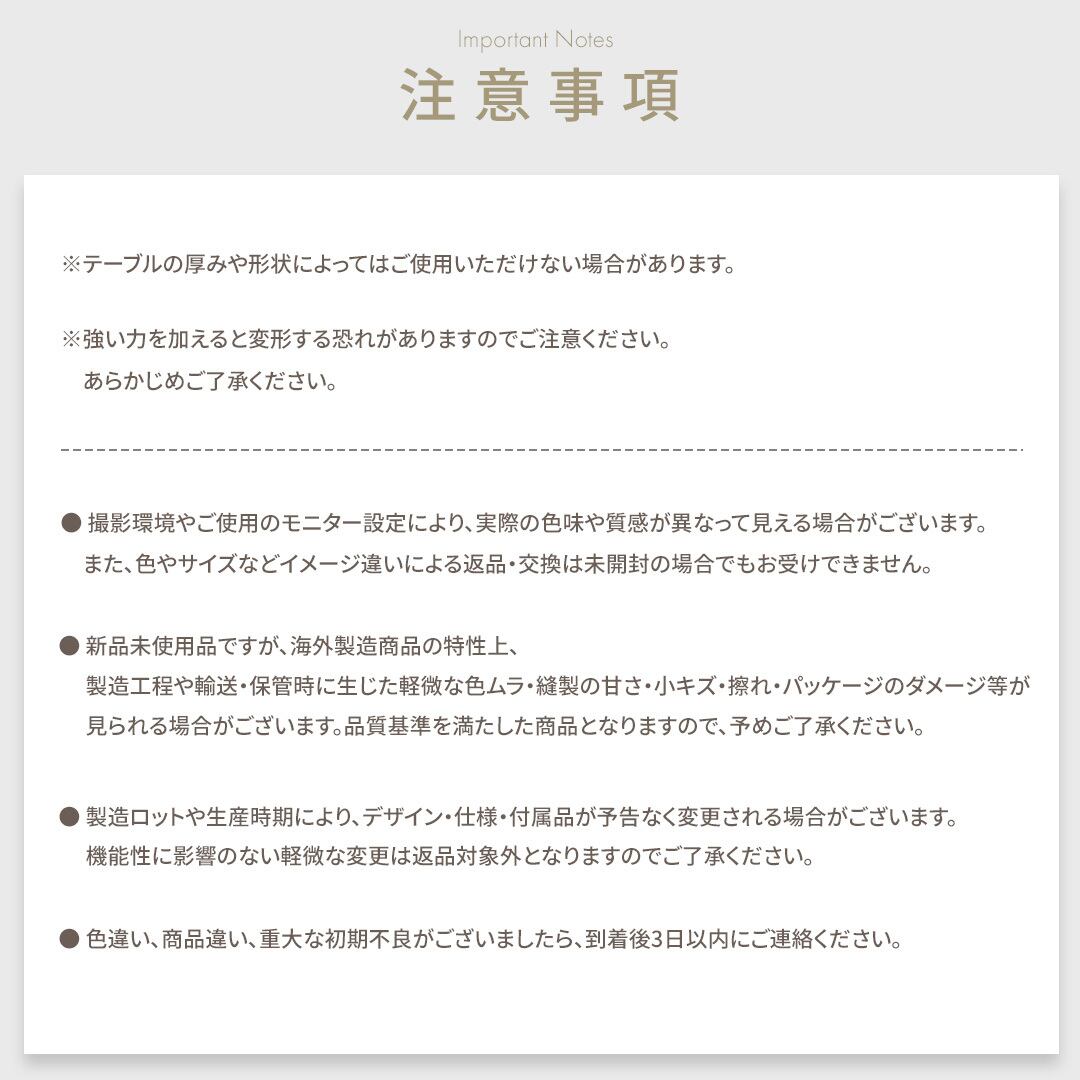 ● 色違い、商品違い、重大な初期不良がございましたら、到着後3日以内にご連絡ください。
