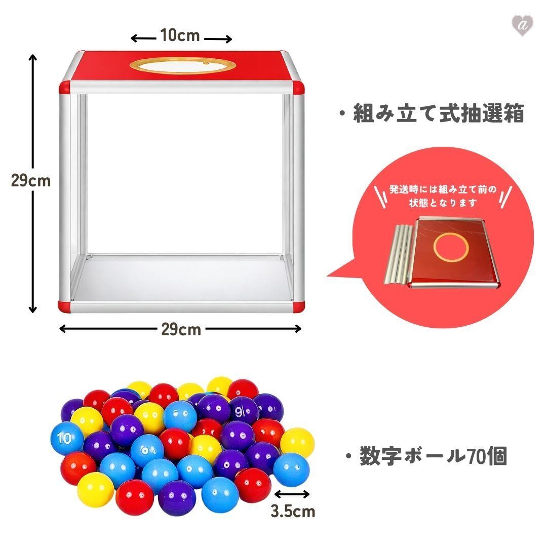 こちらは30cmサイズの 大型抽選箱 × カラフル数字ボール70個セット です。届いてすぐに抽選会がスタートできる、便利なフルセットです。