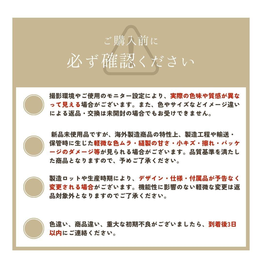 ● 新品未使用品ですが、海外製造商品の特性上、製造工程や輸送・保管時に生じた軽微な色ムラ・縫製の甘さ・小キズ・擦れ・パッケージのダメージ等が見られる場合がございます。品質基準を満たした商品となりますので、予めご了承ください。
