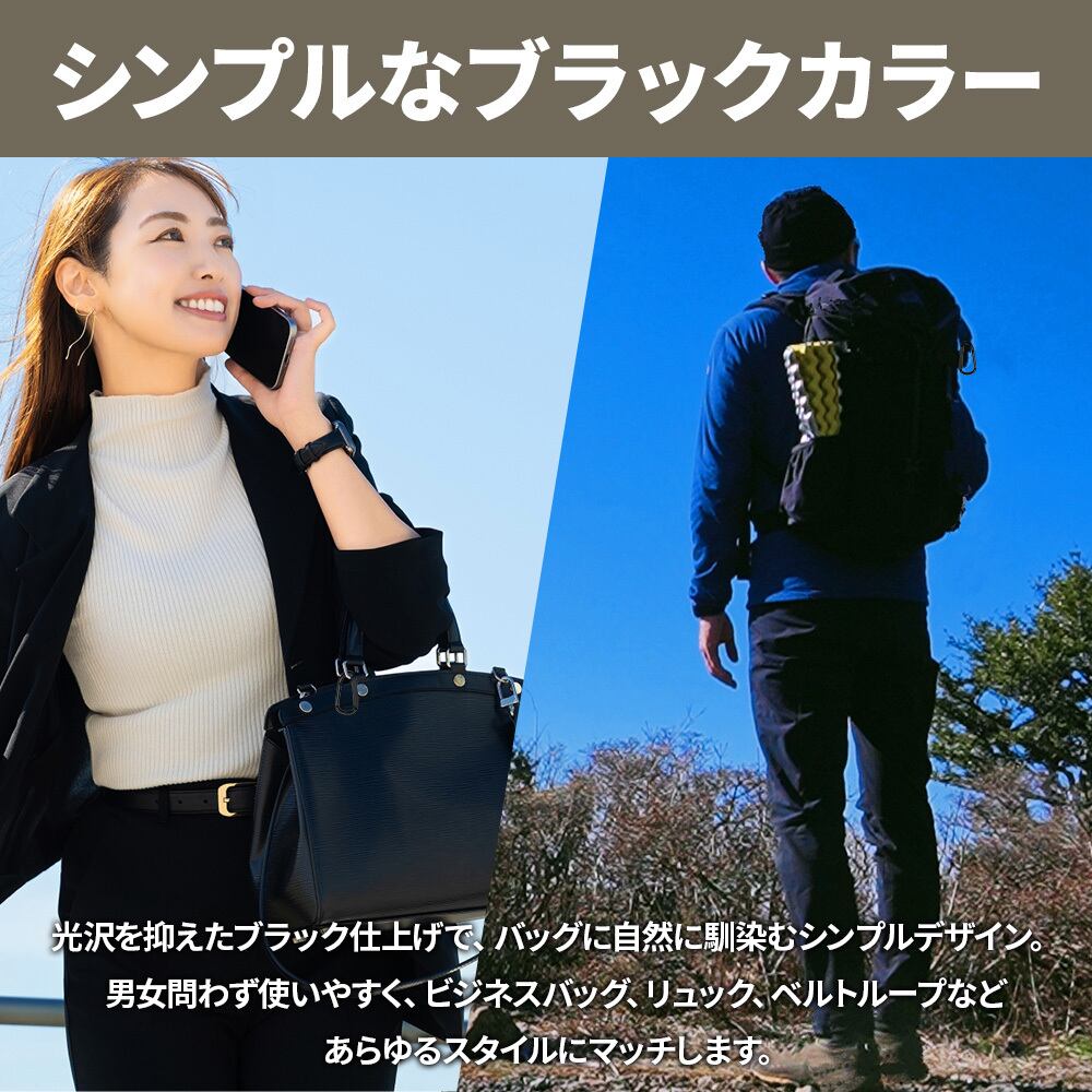 光沢を抑えたブラック仕上げで、バッグやギアに自然に馴染むシンプルデザイン。男女問わず使いやすく、ビジネスバッグ、リュック、ベルトループなどあらゆるスタイルにマッチします。