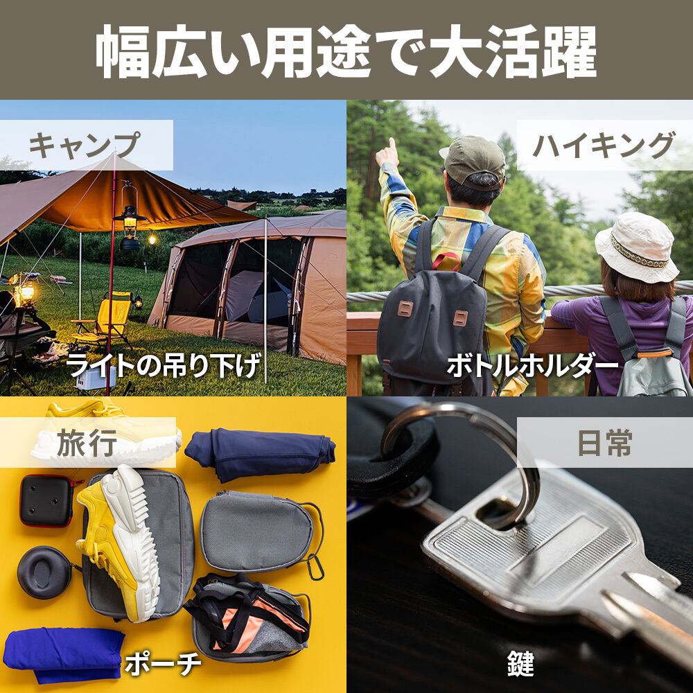 鍵、ミニポーチ、ボトルホルダー、ライト、エコバッグなど、すぐ使いたい小物の取り付けに最適。キャンプ・ハイキング・旅行・通勤バッグなど、さまざまなシーンで「ちょっとした引っ掛け」に便利です。片手で開閉できるゲート式で、スムーズに脱着できます。
