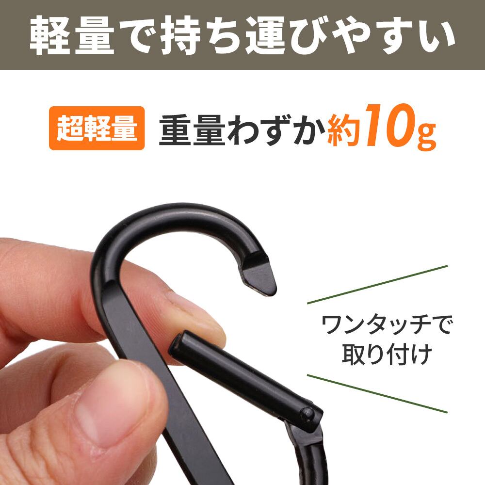6.6cmサイズで扱いやすく、重量わずか約10gの超軽量タイプ。バッグやポーチ、鍵などの小物をワンタッチで取り付けられる便利なカラビナです。アルミニウム合金を使用することで、軽さと耐久性のバランスに優れ、日常使いはもちろんアウトドアシーンでも活躍します。