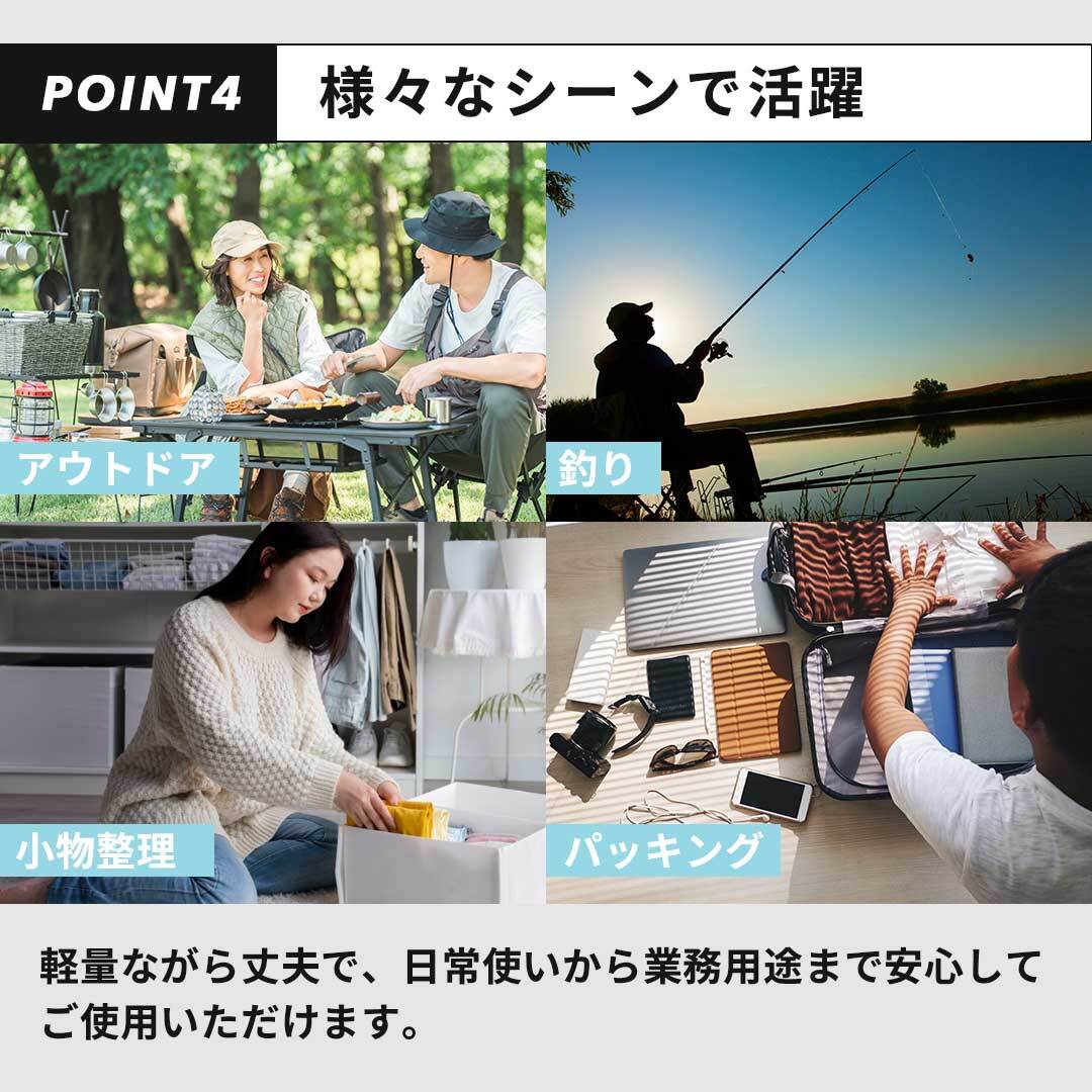 軽量ながら丈夫で、日常使いから業務用途まで安心してご使用いただけます。釣り用品、アウトドアギア、小物整理、旅行時の仕分け袋、店舗備品やパーツ管理など、用途は多彩。ブラックカラーのため汚れが目立ちにくく、実用性も高いアイテムです。
