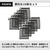 まとめ買いに便利な10枚セットで、家庭用・業務用どちらにもおすすめ。シンプルで使いやすいメッシュ収納袋です。