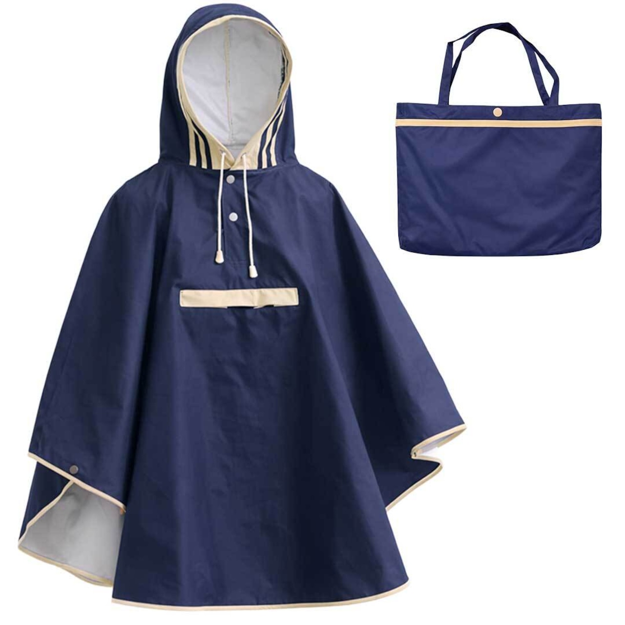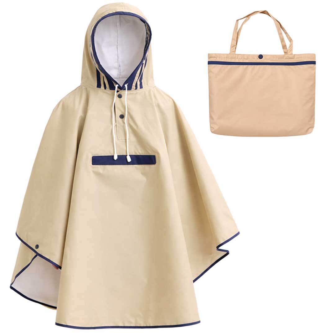 深めのフードはコードで調節でき、風のある日でもしっかりフィット。袖口はスナップボタン付きで腕を動かしやすく、雨の侵入も防ぎます。胸元には便利なポケットがあり、ハンカチなどの小物を収納できる実用的な仕様です。