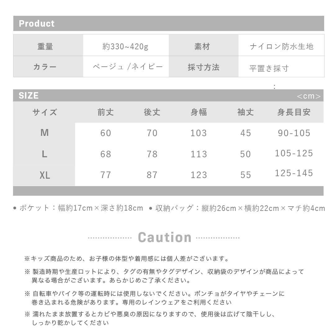 Lサイズ:前丈68cm / 後丈78cm / 身幅113cm / 袖丈50cm / 身長目安 105~125cm