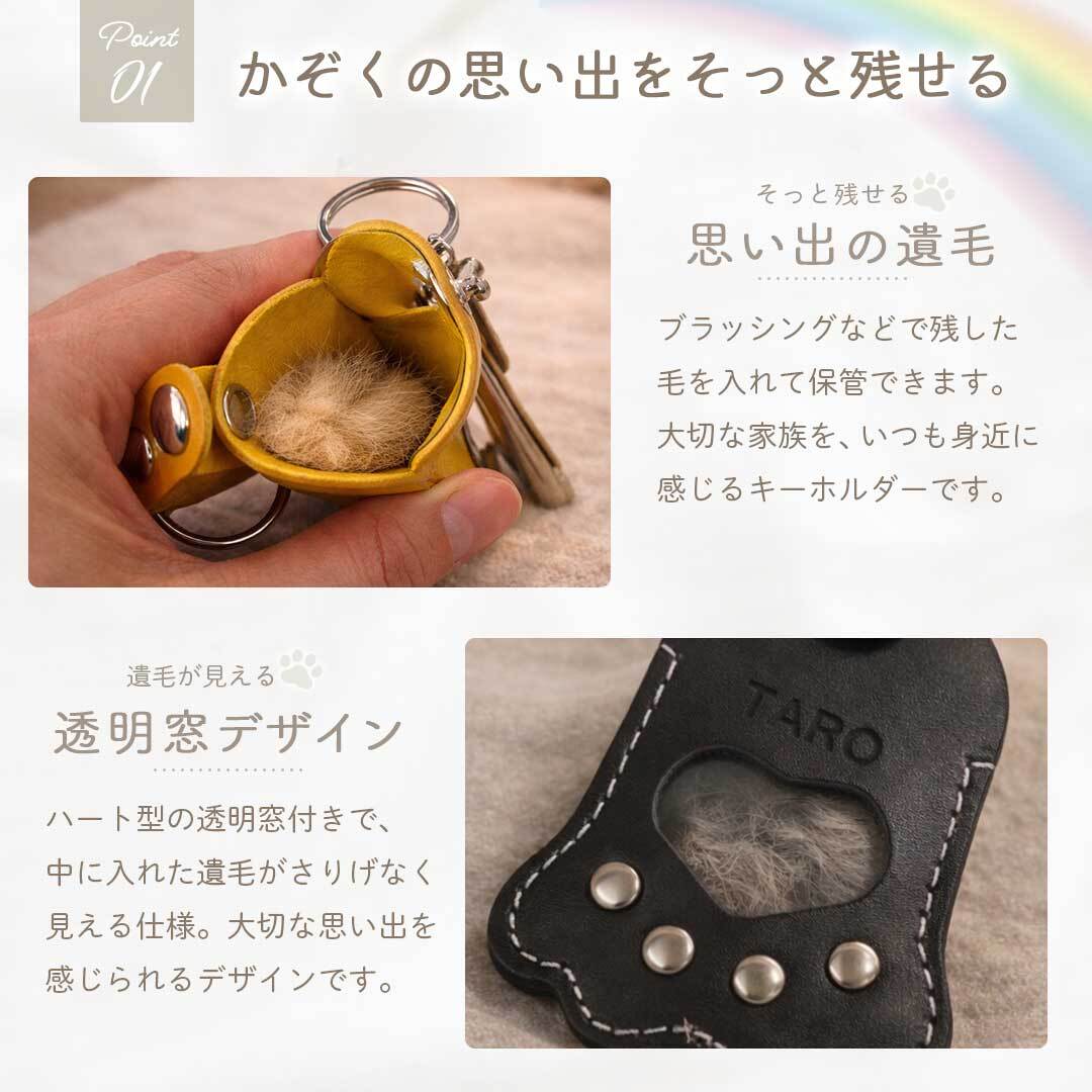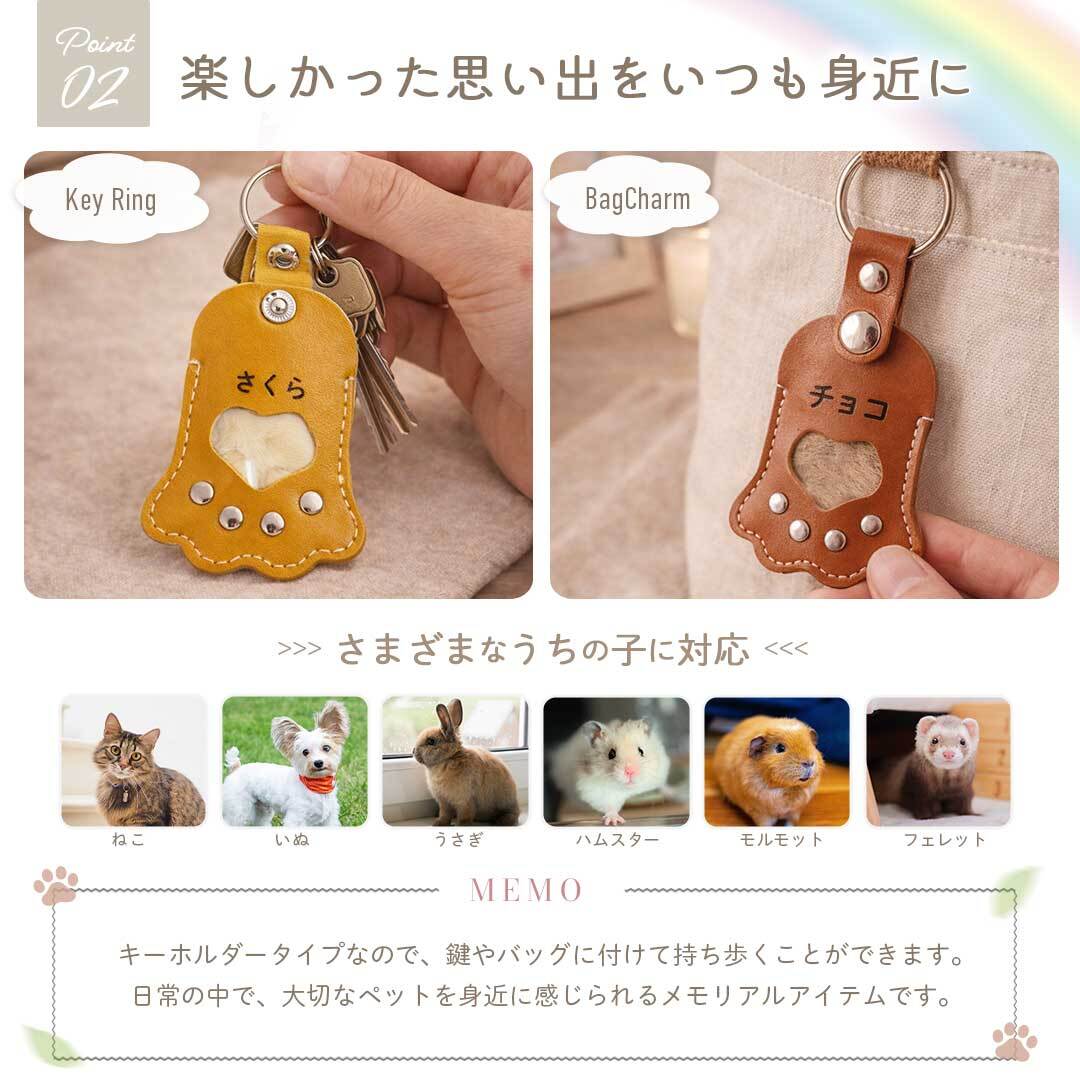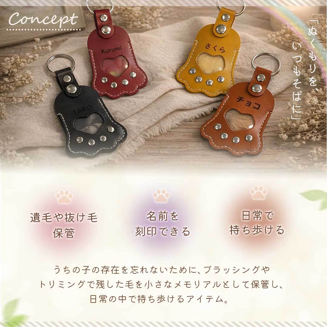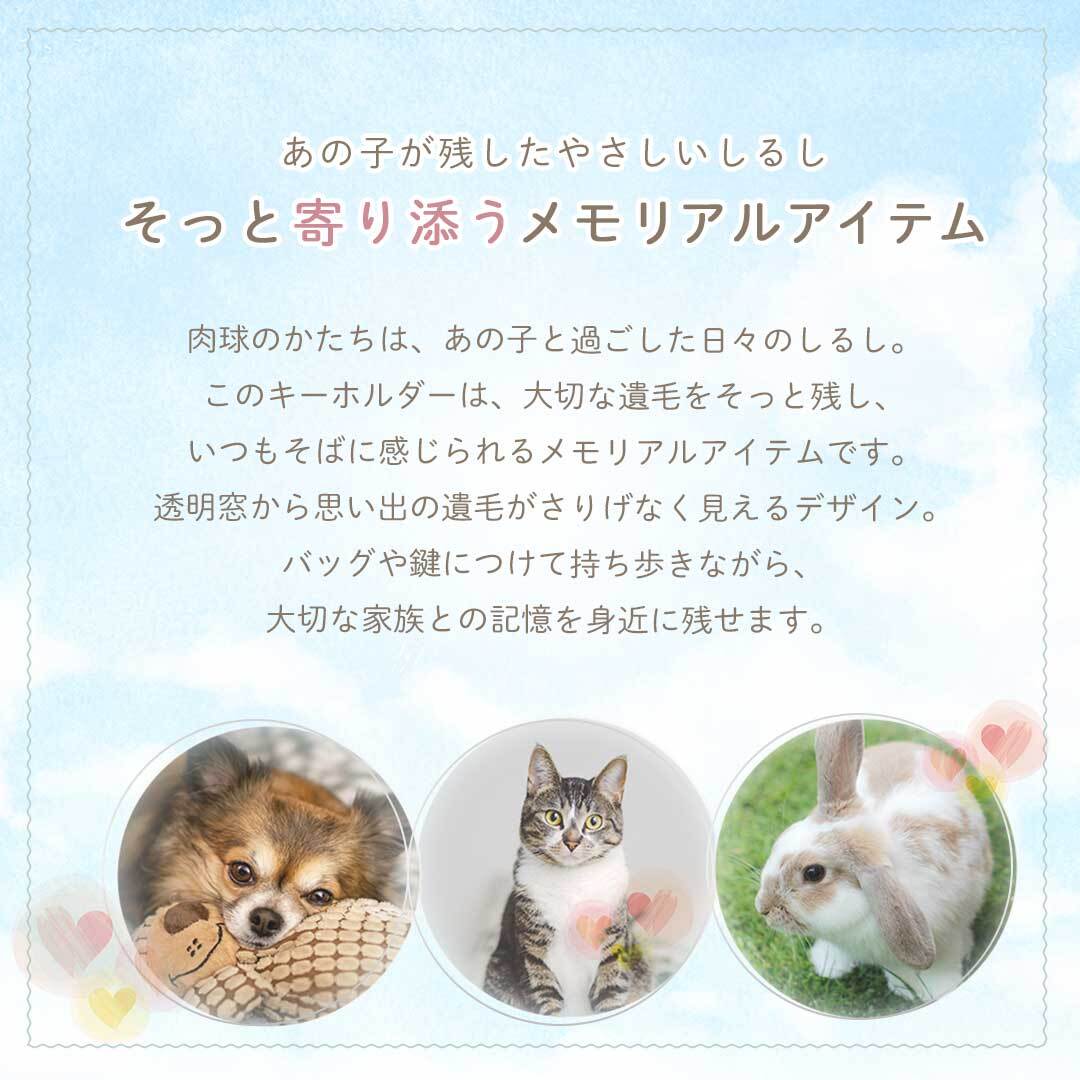 大切なペットの毛をそっと保管できる、肉球モチーフのメモリアルキーホルダーです。