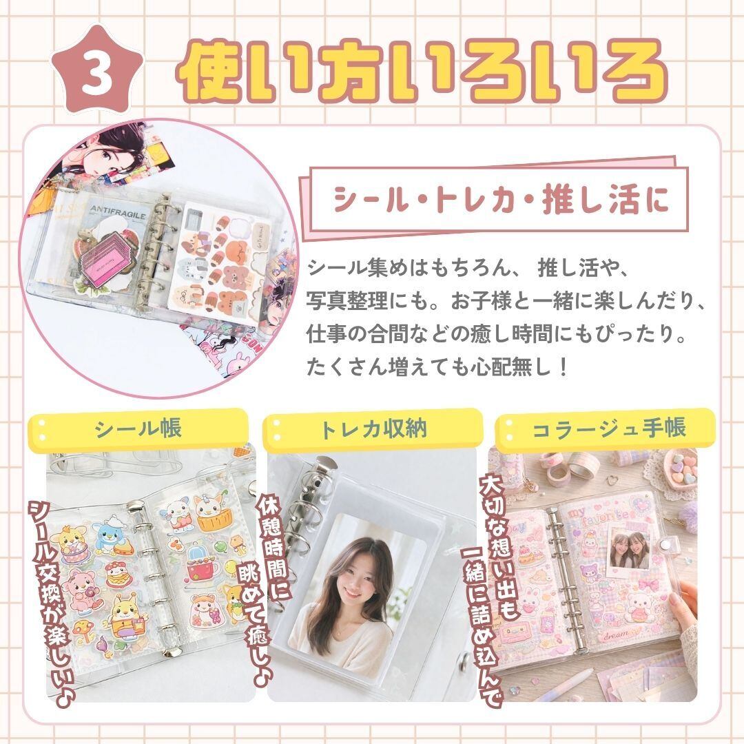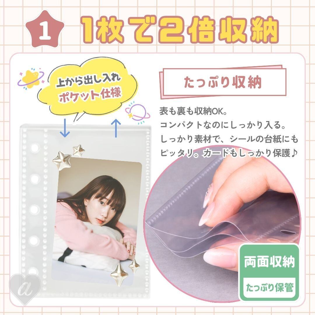 両面収納タイプのため、表・裏どちらにも収納でき、見せる整理・コレクションにも最適です。推し活グッズの整理、シールコレクション、トレカやミニ写真の収納など、幅広い用途で活躍します。