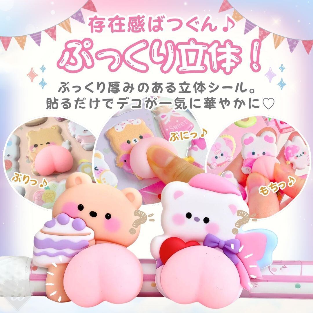 シールは立体的なぷっくり素材になっているため、通常の平面シールとは違い、貼るだけで立体感のある可愛いアクセントを作ることができます。ノートや手帳に貼るだけで一気に華やかな雰囲気になり、日記やスケジュール帳、コラージュ、スクラップブックなどのデコレーションにもぴったりです。シンプルな文房具や小物も、このシールを貼ることでオリジナルのかわいいデザインに変えることができます。