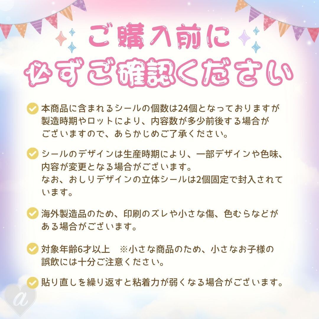 ※本商品に含まれるシールの個数は24個となっておりますが製造時期やロットにより、内容数が多少前後する場合がございますので、あらかじめご了承ください。