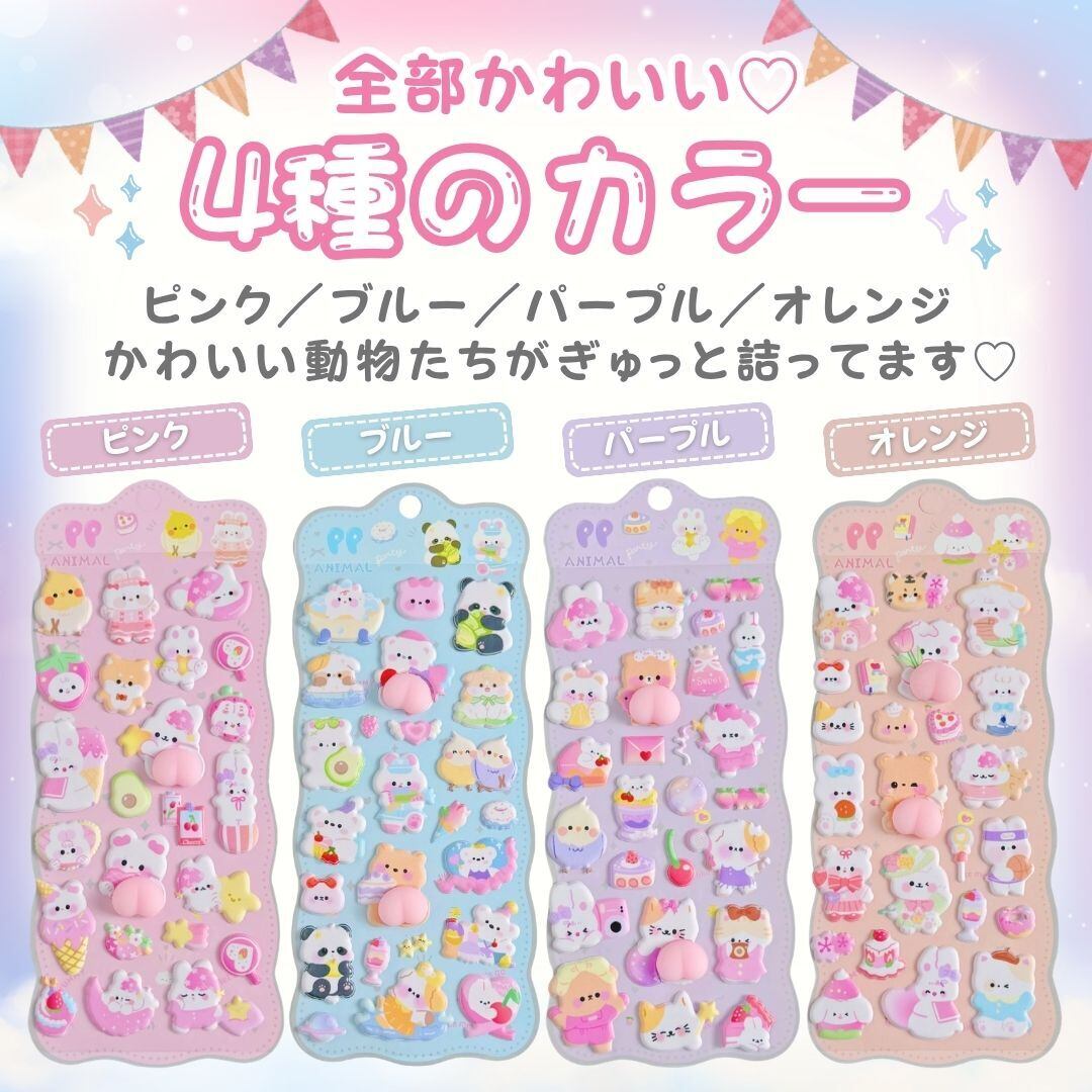 デコシール ぷっくり立体 アニマル 4色全セット デコシールセット おしり シール 立体シール アニマルシール ぷっくりシール 可愛いシール 動物シール デコレーションシール 手帳デコ ノートデコ ステッカー かわいいシール 女の子向け シールセット デコ素材 文房具 ぷっくりステッカー