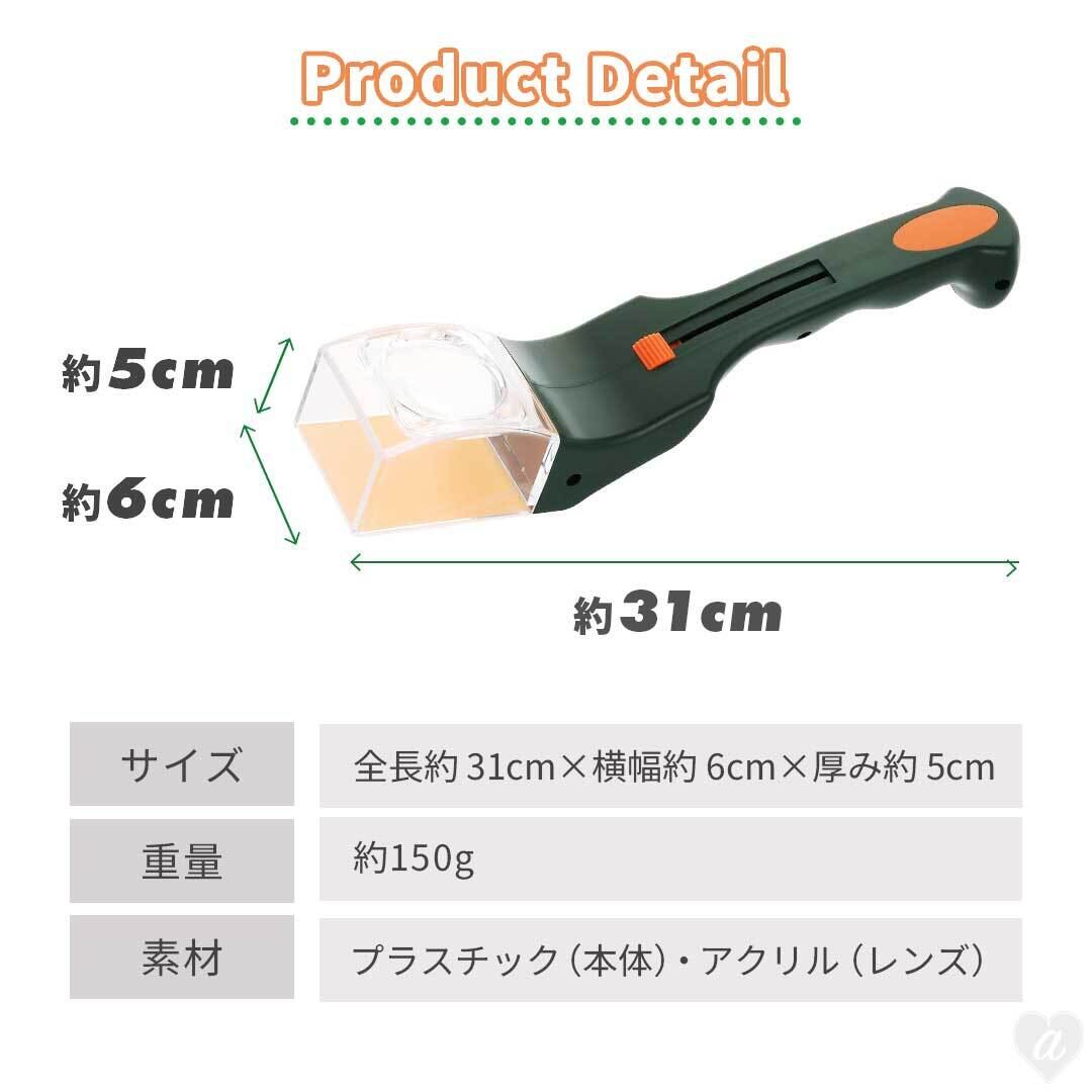 スライド式のトラップでサッとフタを開閉。透明カバーと5倍ルーペ付きなので、捕まえた虫をそのまま観察することもできます。自由研究や昆虫観察にもぴったりで、遊びながら学べるアイテムとしても人気です。
