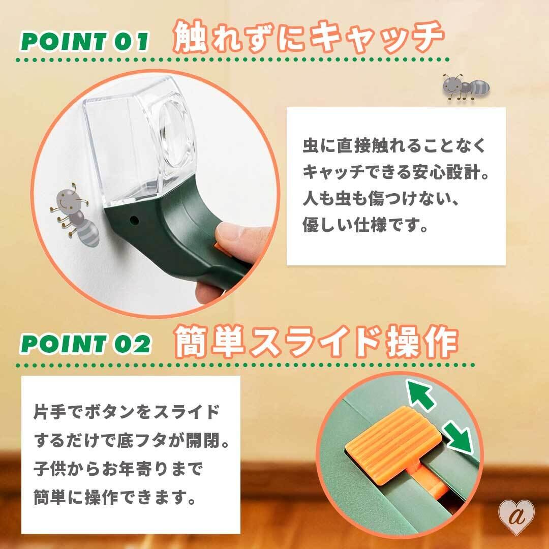虫取り器 触らずキャッチ!拡大レンズ付き 虫取りキャッチャー 電池不要 虫キャッチャー 虫取り 捕虫器 捕獲 カメムシ捕獲 バグキャッチャー 殺虫剤不使用 室内虫 ベランダ 蜘蛛 クモ カメムシ 毛虫 虫 駆除 害虫駆除 虫除け 虫捕り ルーペ付き スライド式捕虫器 透明カバー