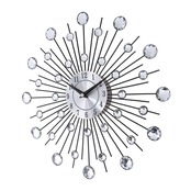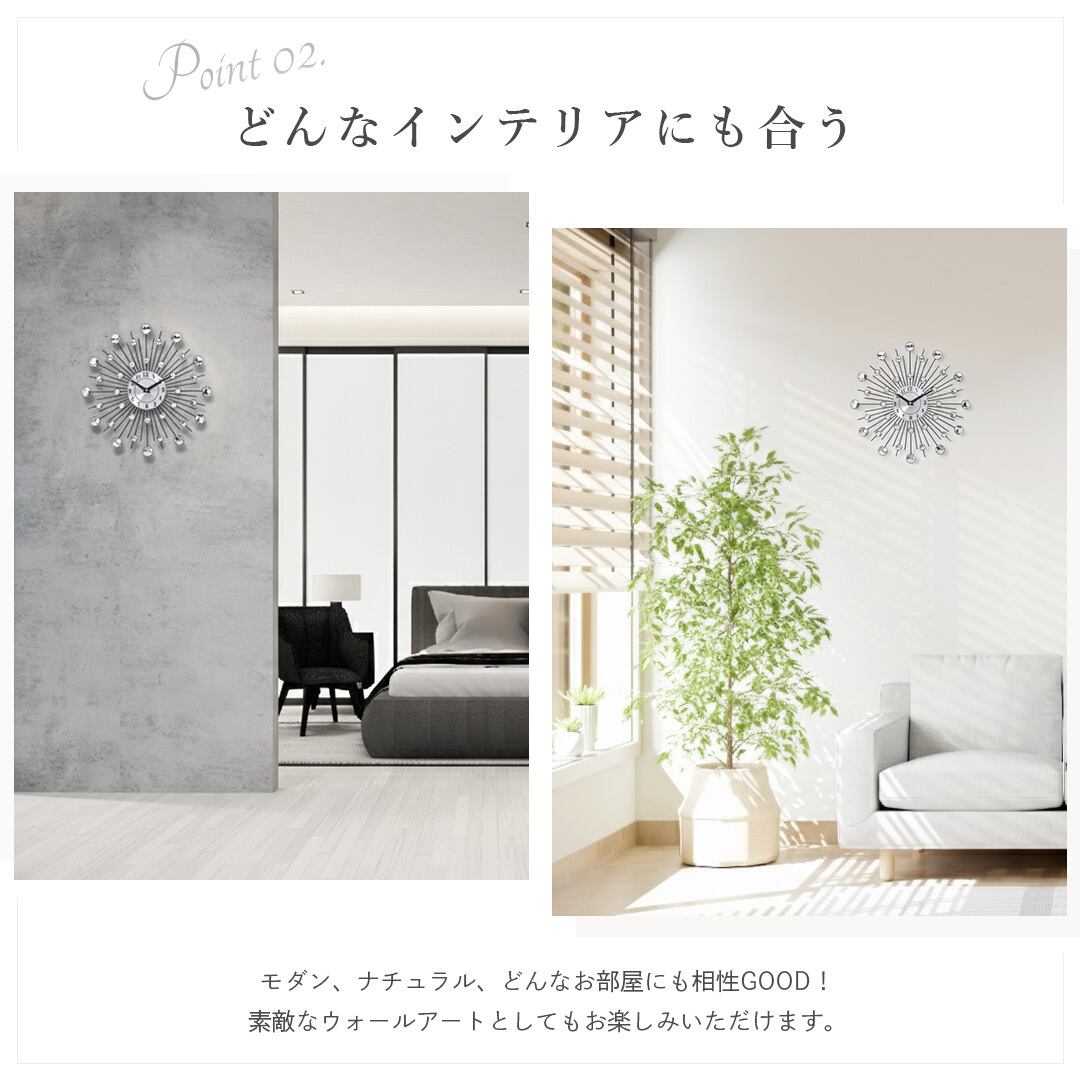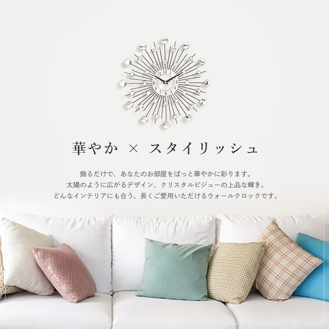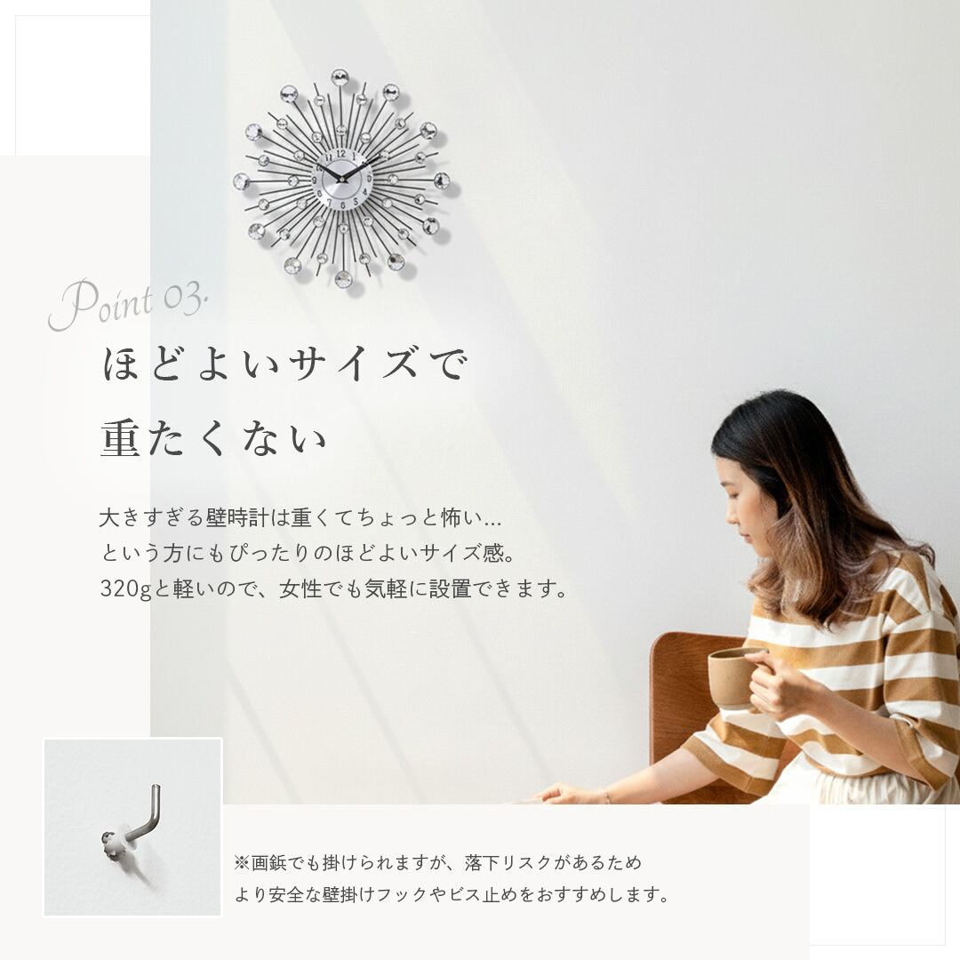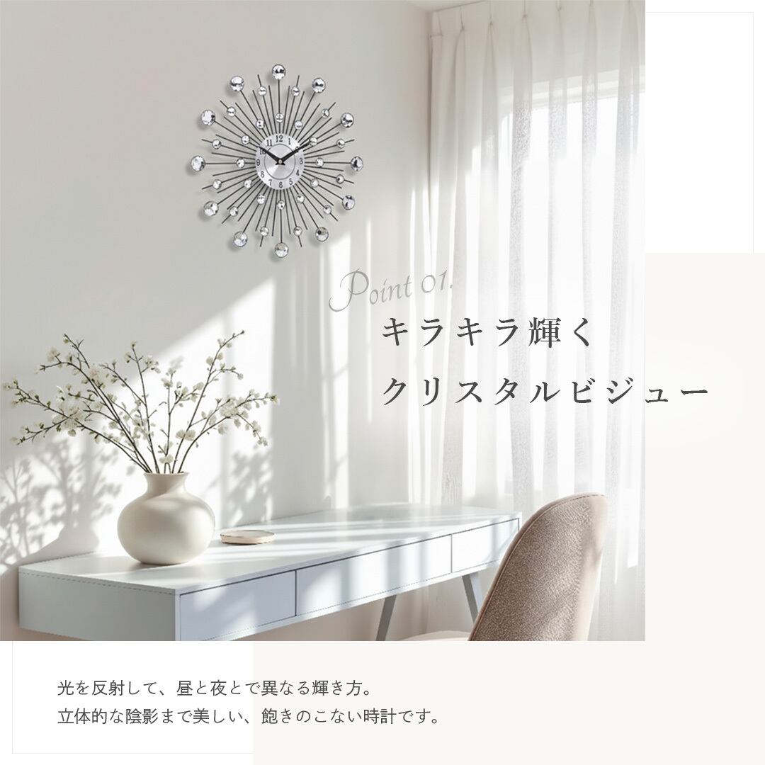 華やかさとスタイリッシュさを兼ね備えた「アメリカンクロック キラキラ掛け時計」。太陽のように広がる放射デザインとクリスタル調パーツが輝きを放ち、空間を一気に華やかに彩ってくれます。モダン・ホテルライク・北欧風・ナチュラルテイストなど、さまざまなインテリアに馴染みながら、上品なアクセントとして存在感を発揮するウォールクロックです。