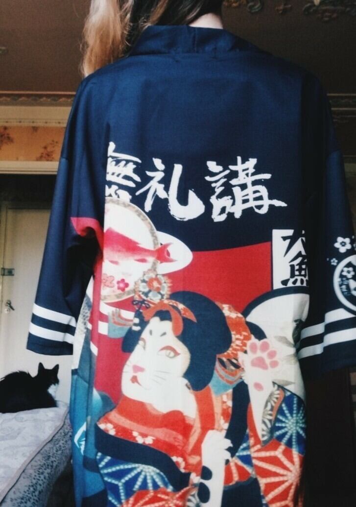 こちらは無礼講の法被です。着物の猫の女性と魚を和柄にアレンジしています。とても風情があり、和の心を大切にしています。