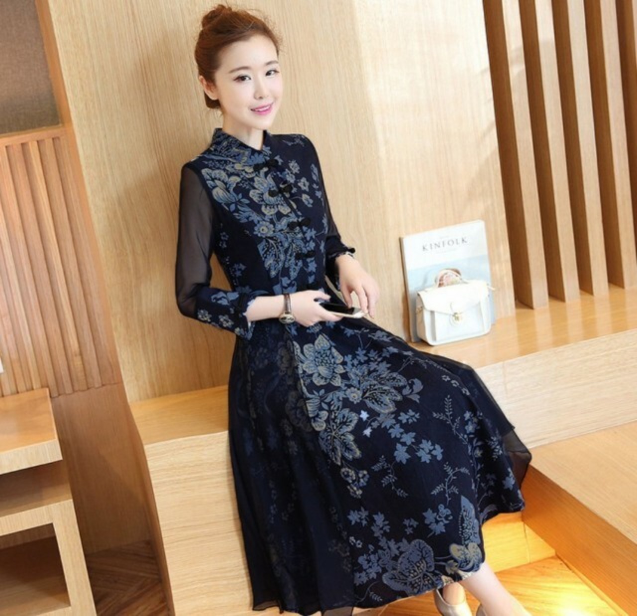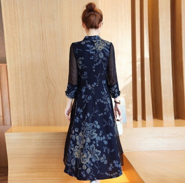 【在庫限り】ネイビー 綿のチャイナドレス 衣装 ロング 演奏会 パーティードレス 旗袍 チーパオ チャイナ服 中国服 花柄 aライン シースルー アオザイ チャイナドレス 結婚式 二次会