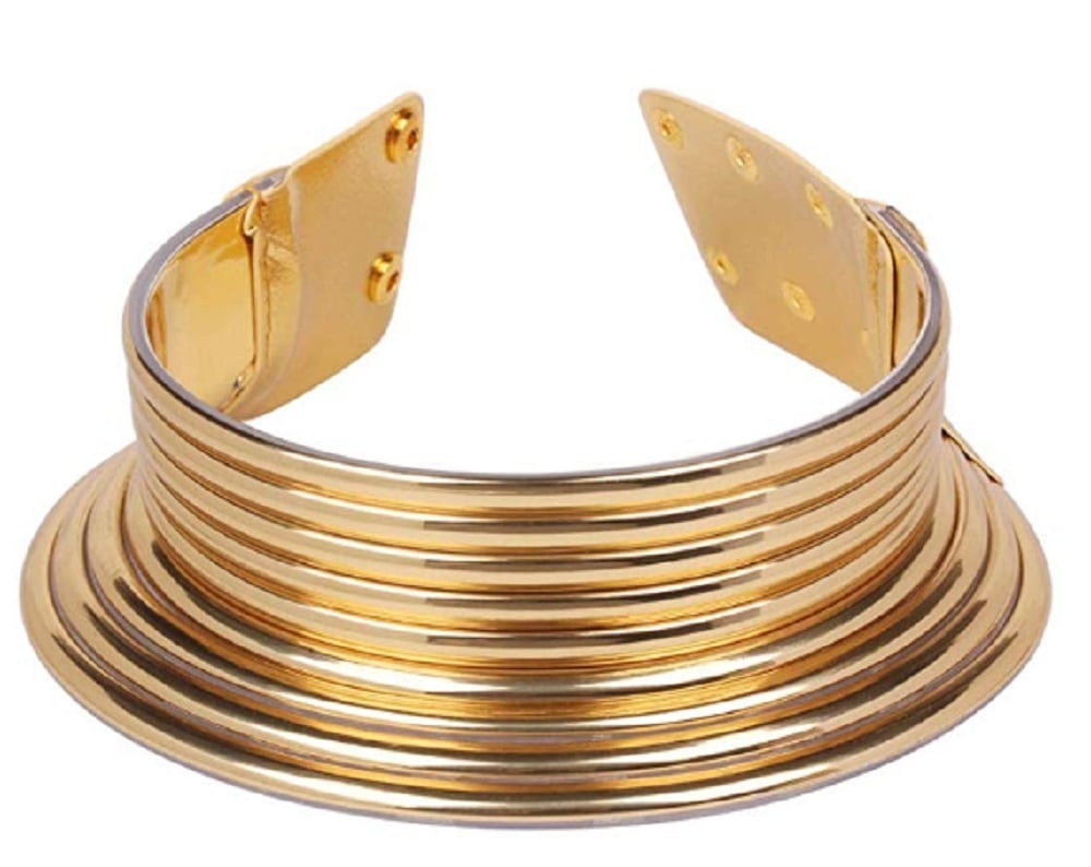 ゴールドカラーのシンプルなリング型の首輪をつなげたようなユニークなネックレスチョーカー。