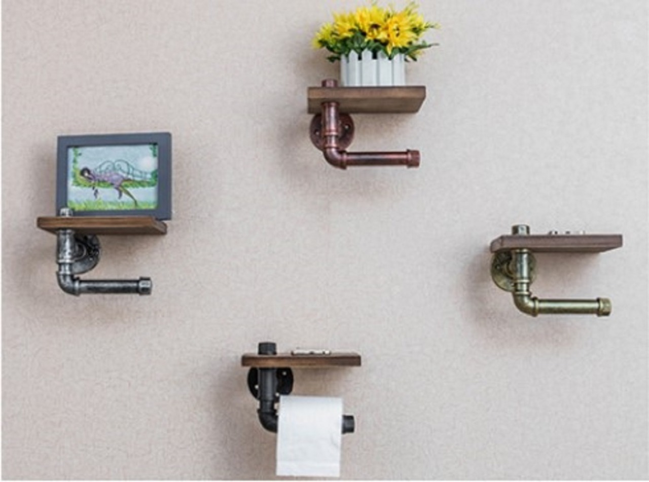 パイプ トイレットペーパー ペーパーホルダー アンティーク調 家具 トイレ 壁付け 木製 ウッド 組立式 無垢木製 棚付き スマホ 小物 消臭剤 本 写真 収納 整理 オシャレ レトロ 北欧 男前インテリア