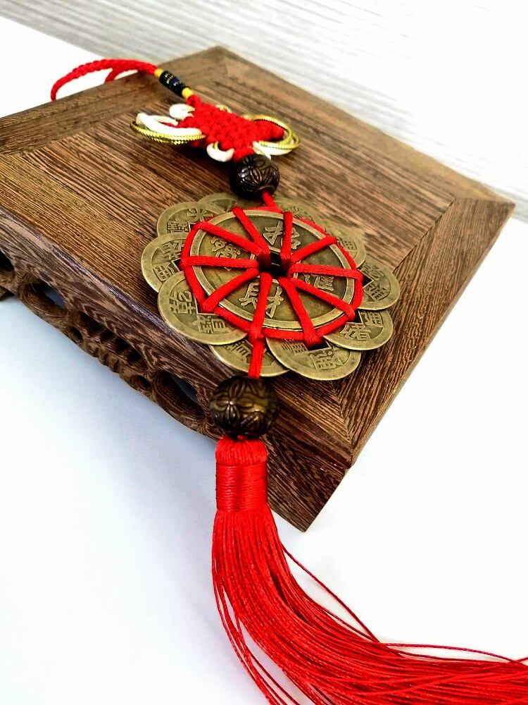 表と裏に大きな風水八卦銭が1枚ずつあり、その間に、10枚の小さな風水古銭があります。