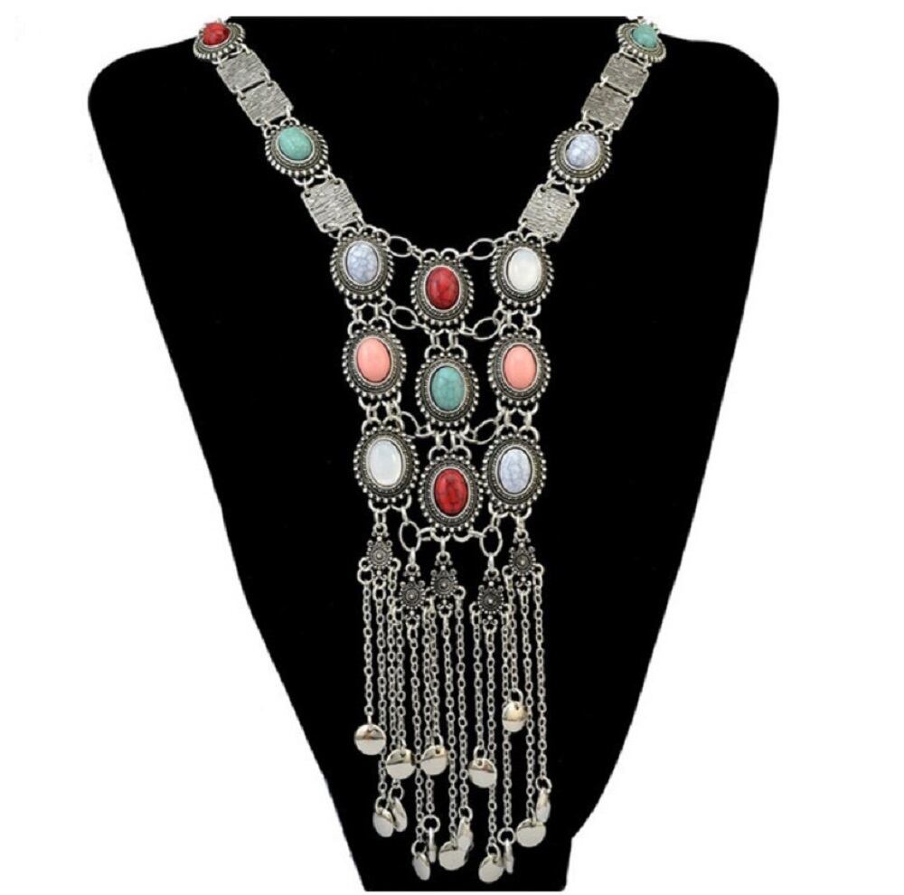 【在庫限り】70cm ロングネックレス ボヘミアン カラフル 13ストーン コイン 首輪 ロングネックチョーカー シルバー 銀色 民族 文化祭 舞台 劇団 踊り ベリーダンス 社交ダンス