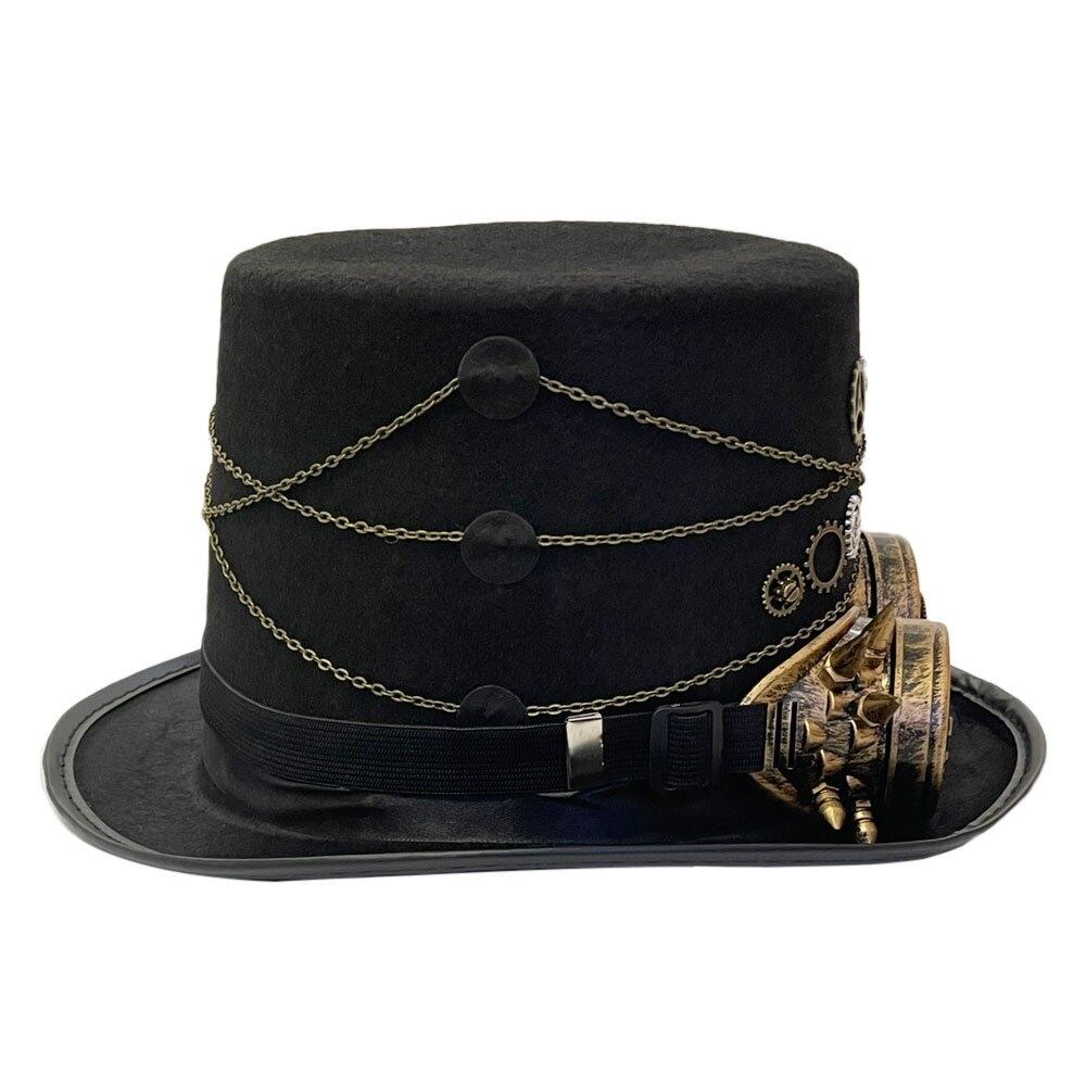 スチームパンカー必見のヘッドアイテム、ギア帽子です。歯車チャームや、ゴーグルが目を惹く、アンティーク、ゴシックテイストの本格的なシルクハットです。正面にゴーグルを装着しており、トゲトゲ文字盤ゴーグルで、レンズが時計デザイン。文字盤、歯車です。薔薇とゴーグルは分離できるので嬉しい!