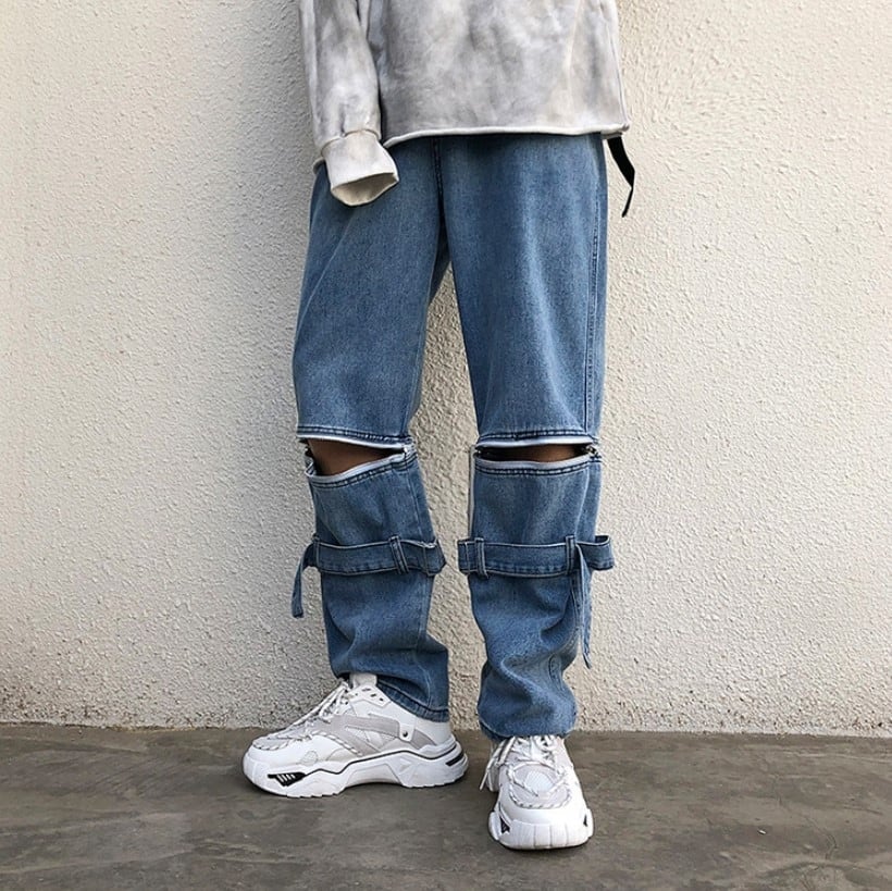 【在庫限り】デニム ベルト ジッパー ボトムス Gパン 韓国ファッション ズボン ジップパンツ 紐 ジーパン レッグベルト クラシック ヴィンテージ アンティーク バースデー ギフト ファッション k-pop 韓流 韓国 ビッグシルエット ユニセックス