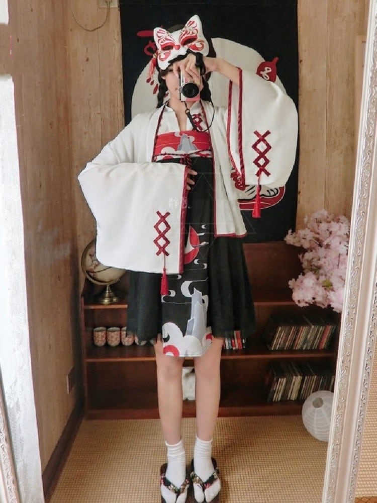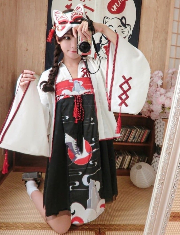 縁起が良いとされる鶴がモチーフの巫女風ワンピースです。モダンな印象を残しながらも、かわいいスタイルを確立する色の組み合わせも見事です