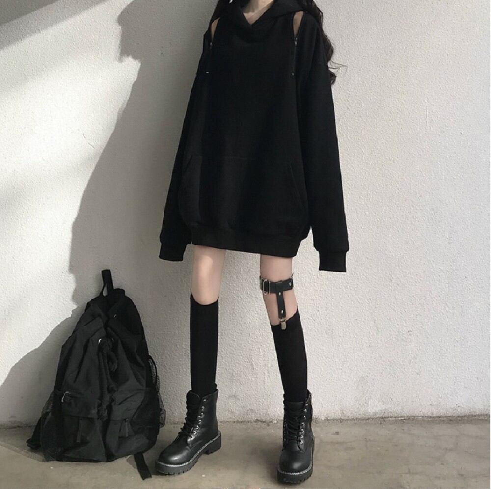 パーカー 両肩出し フード付き ブラック ビッグシルエット オフショルダー 病みかわいい 韓国ファッション オルチャン 韓流 ゴシック ゴスロリ V系 ヴィジュアル系 ロリータ ダーク系 k-pop 韓流 韓国 ビッグ シルエット プルオーバー