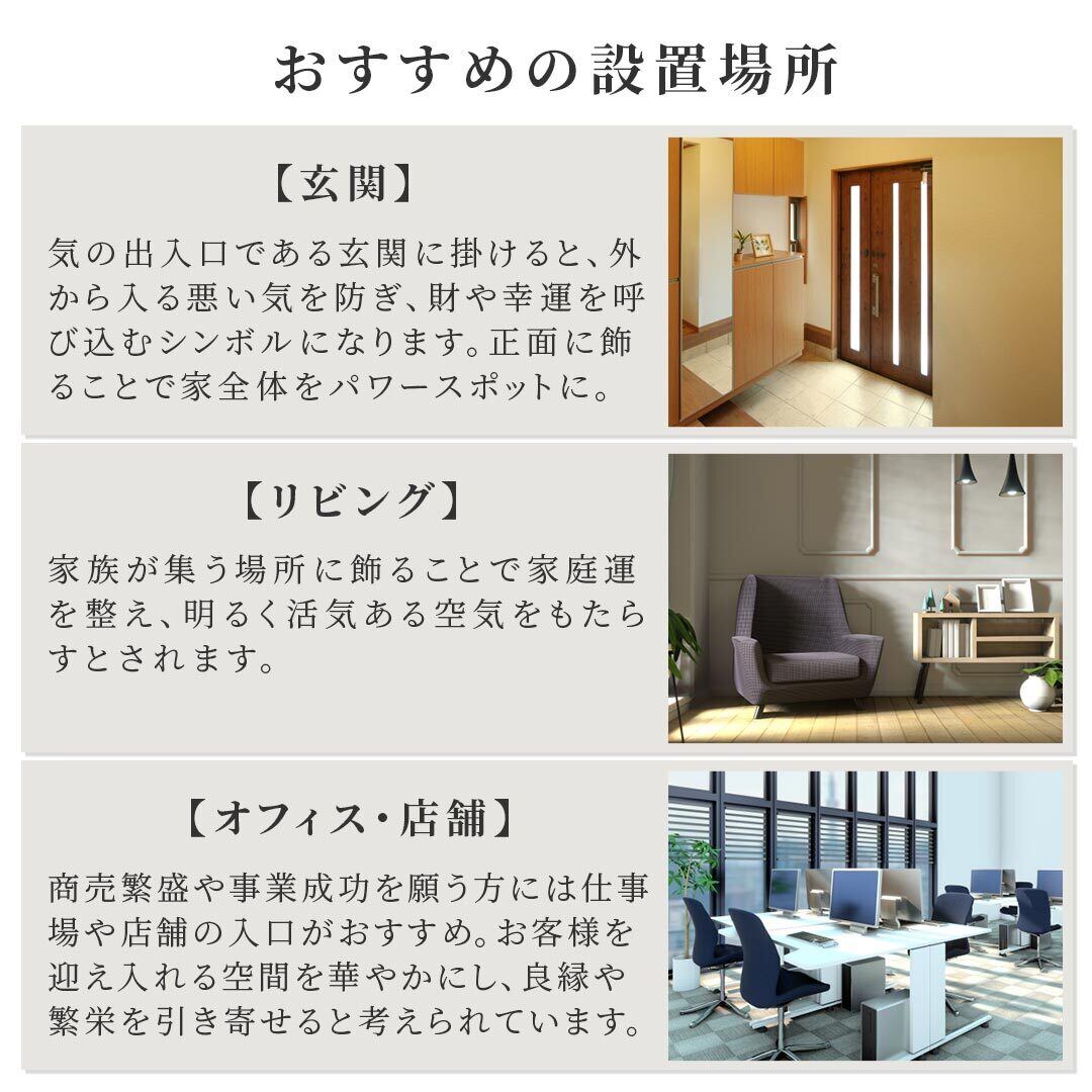 気の出入口である玄関に掛けると、外から入る悪い気を防ぎ、財や幸運を呼び込むシンボルになります。正面に飾ることで家全体をパワースポットに。