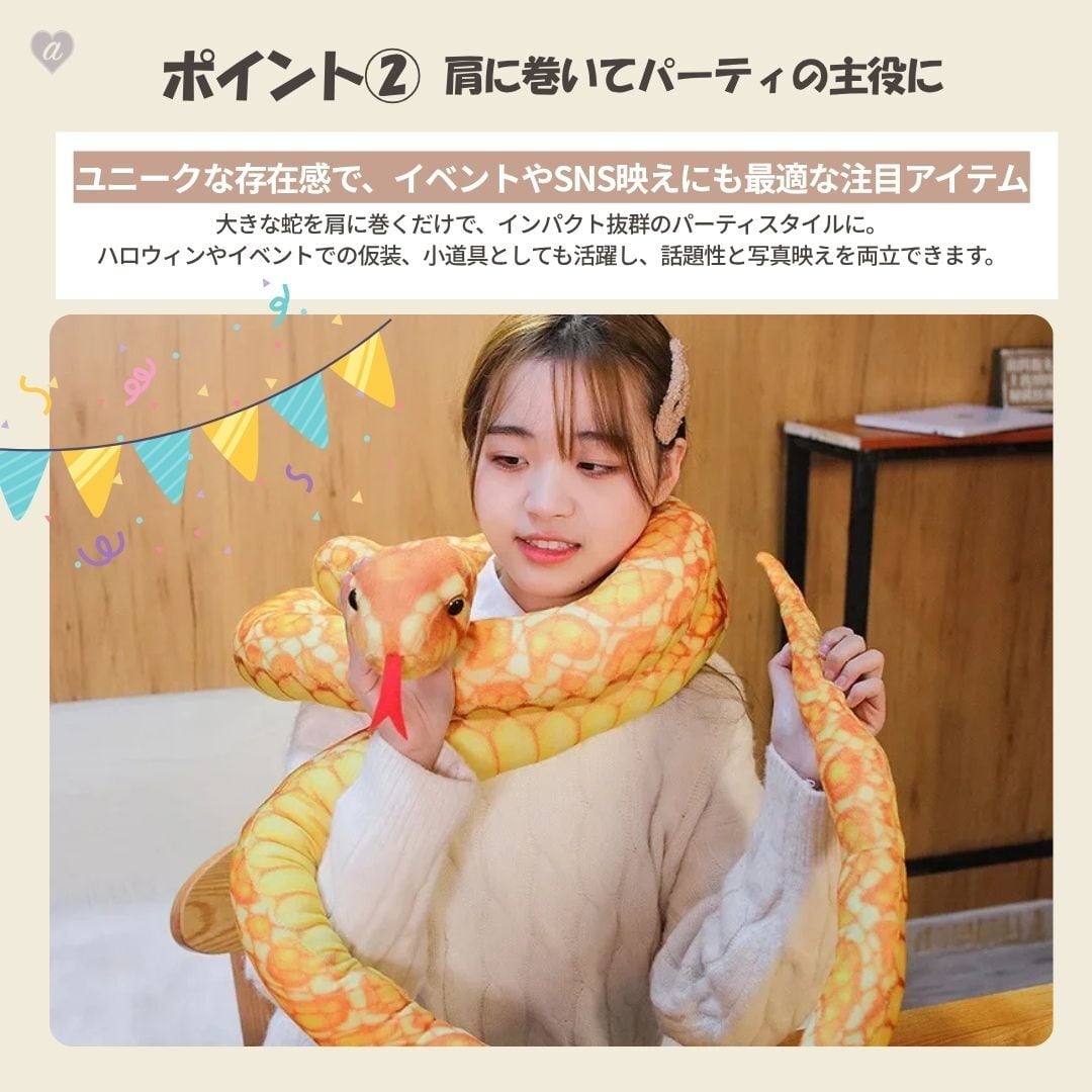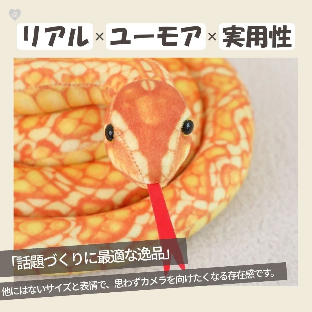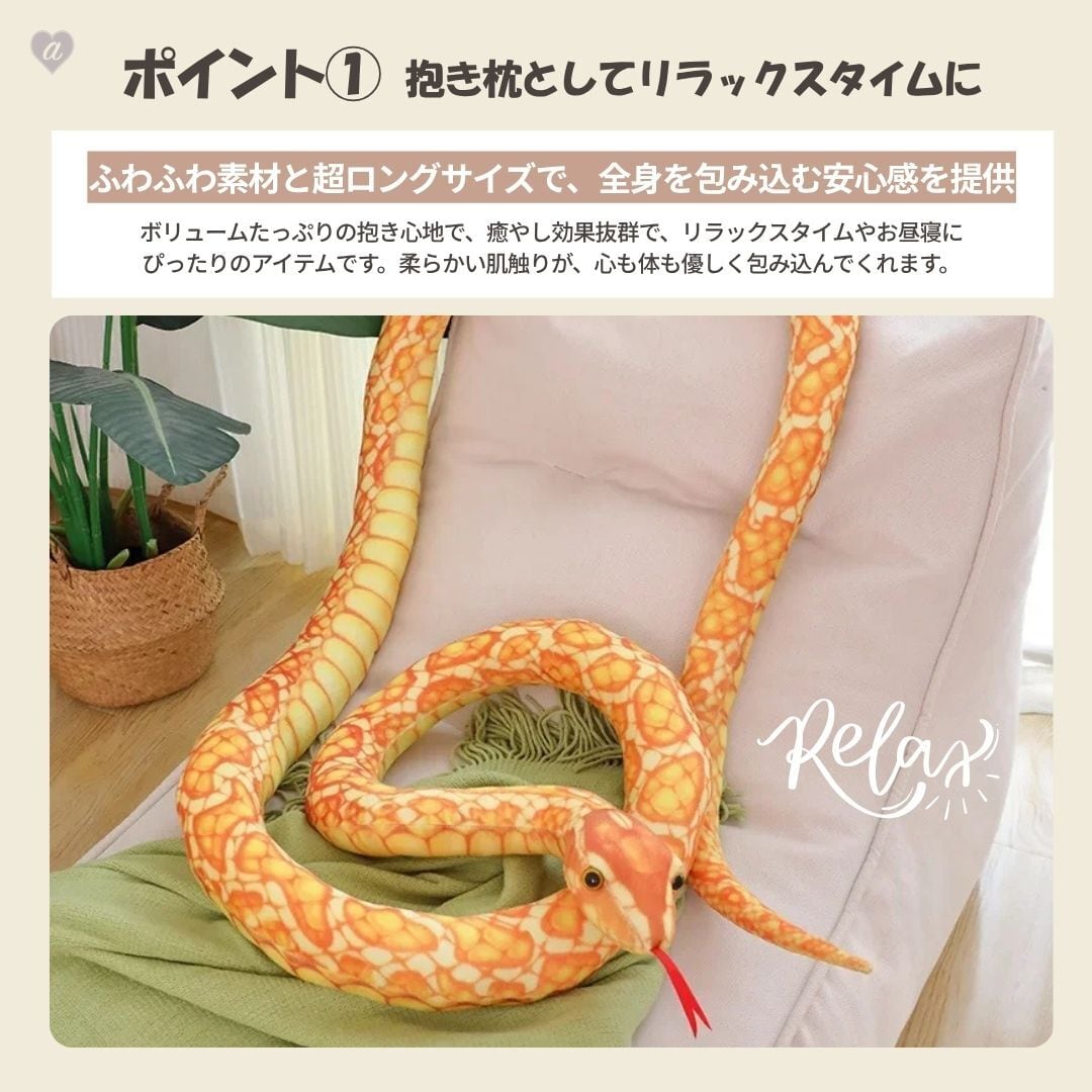 特大サイズの蛇のぬいぐるみです。まるで本物のような柄と、思わず笑ってしまう愛嬌たっぷりの顔が魅力。やわらかいクッション素材でできているので、首や体に巻きつけたり、抱き枕のようにしてお昼寝にもぴったりです。