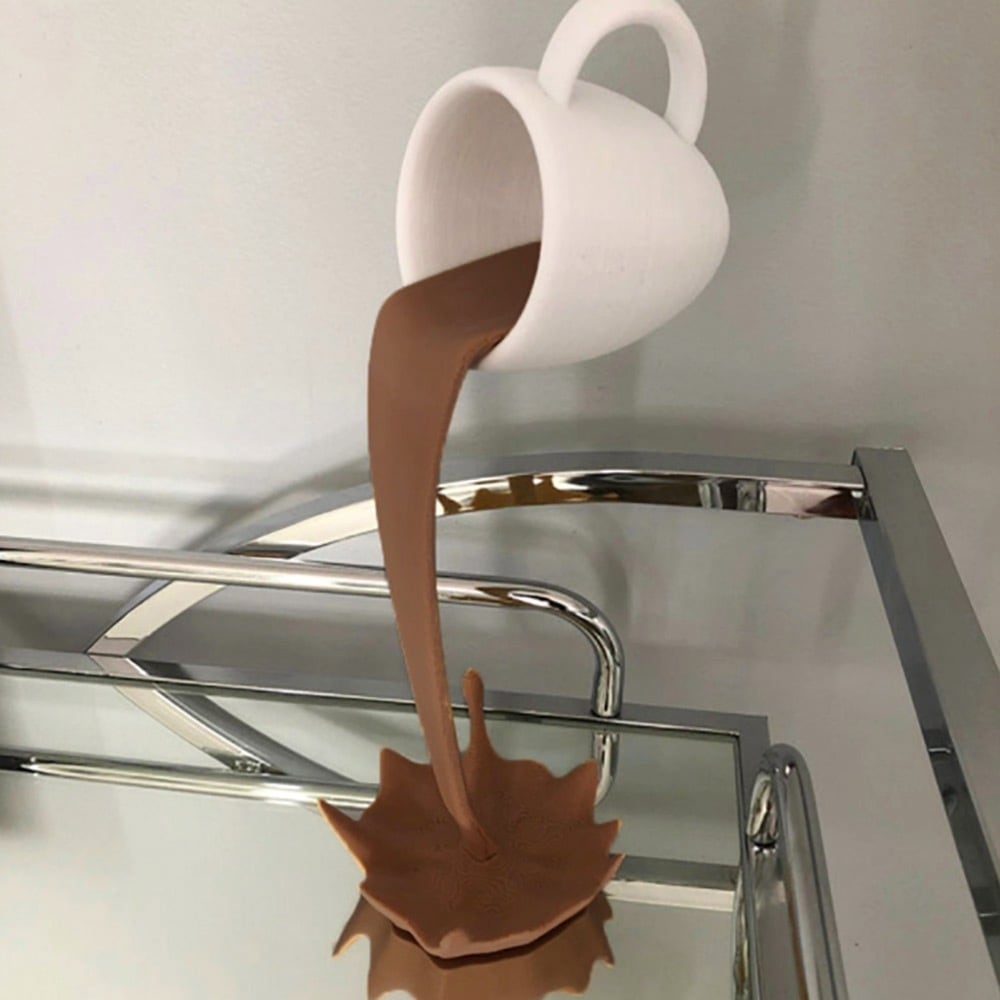 こちらは可愛くてコミカルなデザインのカップから溢れるコーヒーをイメージしたオブジェです。まるで本当にカップからコーヒーが溢れているかのよう!