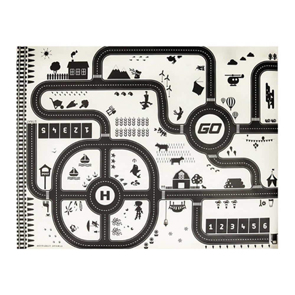 プレイマットに描かれている街の中には道路、横断歩道、ヘリポート、ロータリー、ヘリコプター、気球、家、ヤシの木、イルカ、ポスト、線路、街灯、カタツムリ、牛、花、ガソリンスタンド、駐車場、カカシ、船、パンダ、うさぎ、雪の結晶、山、コーンなどたくさんの生き物や場所があり、飽きることなく遊び続けることができます