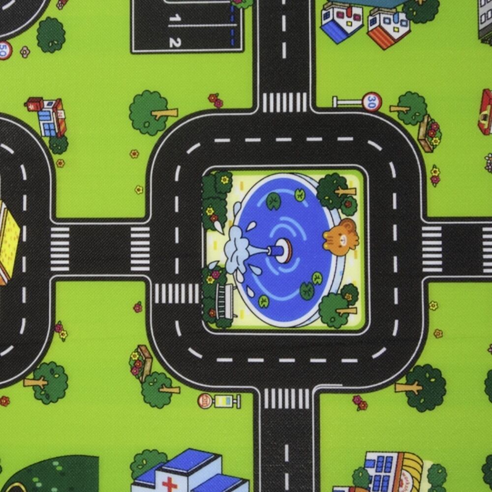 プレイマットに描かれている街の中には道路、横断歩道、動物園、ライオン、ゾウさん、キリン、猫、噴水、観覧車、メリーゴーランド、遊園地、病院、家、信号機、線路、花、ガソリンスタンド、公園、時計、建物、交番、りんごなどたくさんの生き物や場所があり、飽きることなく遊び続けることができます