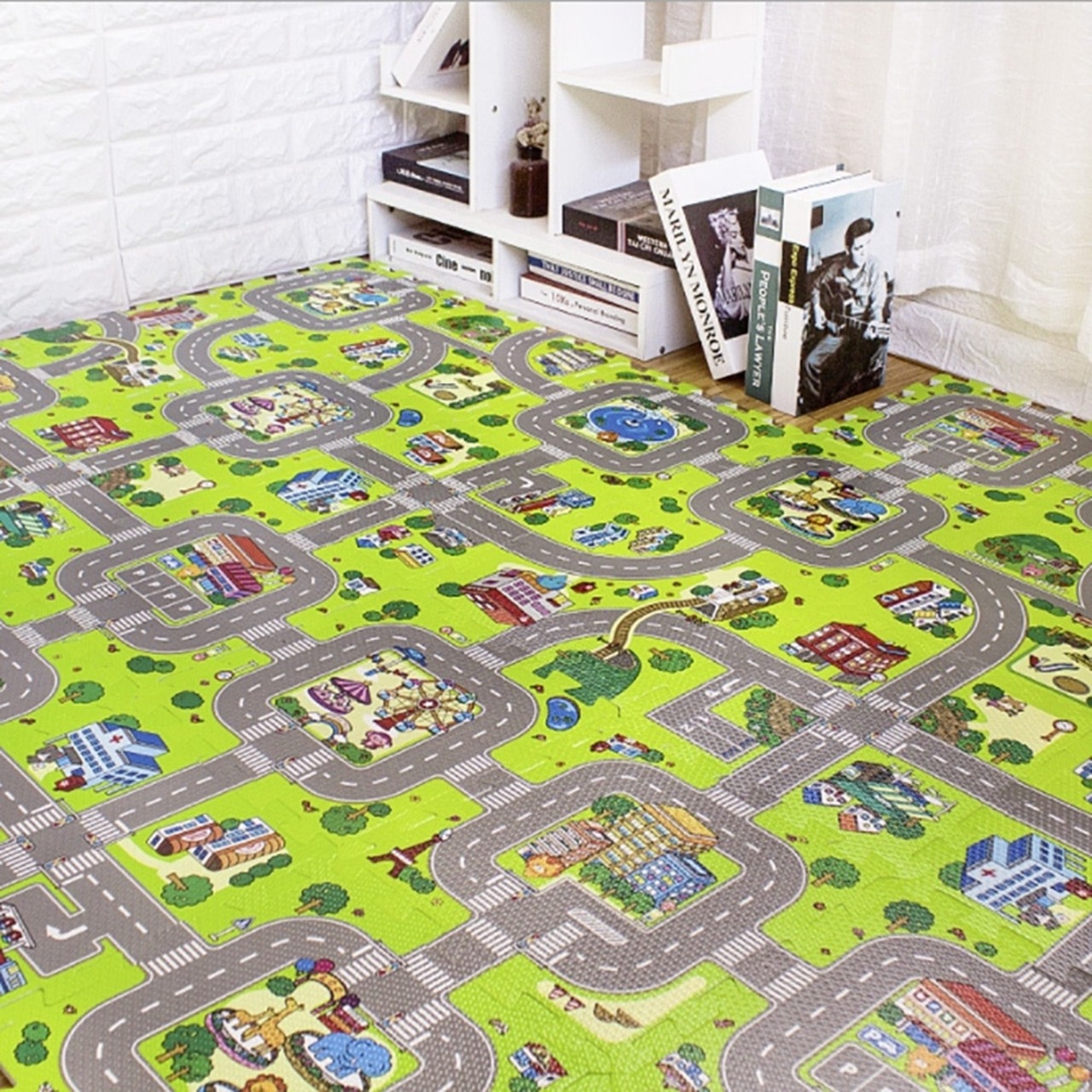 マットに描かれている街の中には道路、横断歩道、信号、遊園地、動物園、公園、噴水、郵便局、木、トンネルなどたくさんの絵が描かれており、飽きることなく遊び続けることができます