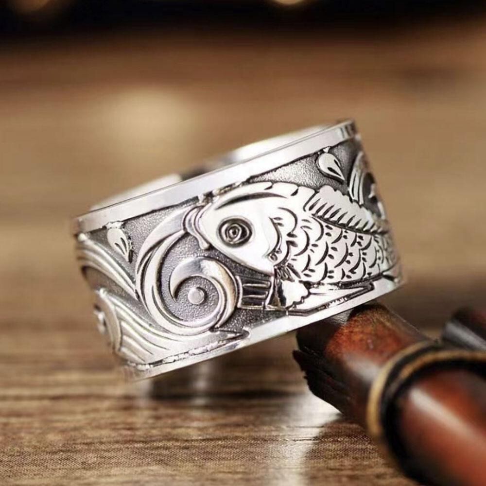 圧倒的な彫金技術で見事に造型された鯉と般若心経が大迫力のリングです。鯉モチーフの、鯉が飛翔しているようなデザインです