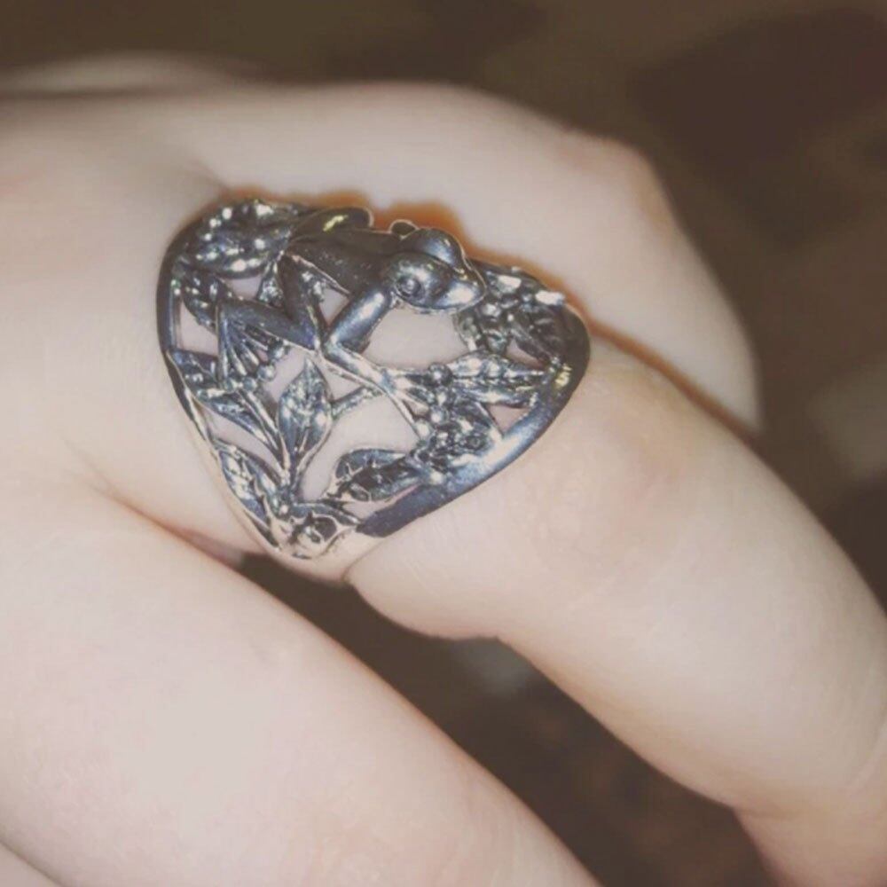 カエルがとてもかわいいシルバーリングです。カエルの遊び心あるデザインにうきうきとしてしまいます。面白いデザインですが、ずっしり重厚感があります