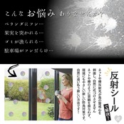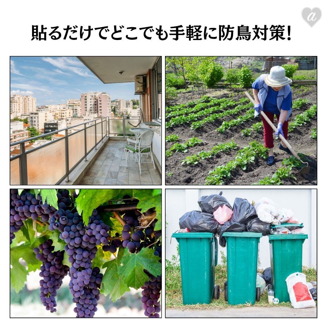 光を反射することで鳥や小動物の警戒心を刺激し、侵入対策として活用できる反射シールです。畑や果樹園のほか、ベランダやゴミ置き場など、さまざまな場所に貼るだけで設置が完了。ネットや柵などの大掛かりな対策をせずに、手軽に導入できるのが特長です。