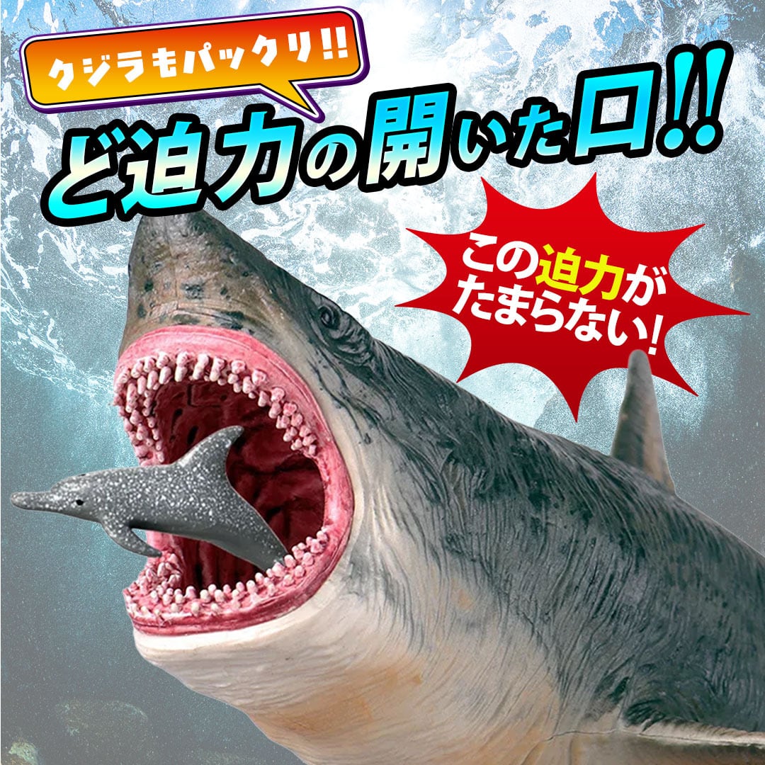 大迫力!海の王者メガロドンの模型です。男の子が大喜びすること間違いなしのサメです。まるで太古の時代にタイムスリップしたようなワクワク感!シルエットの細部までこだわり、まるで本物かのようなメガロドンです。 お部屋に飾るだけで、お部屋は一気に古代に大変身!ドキドキ・ワクワクなサメルームにできちゃいます