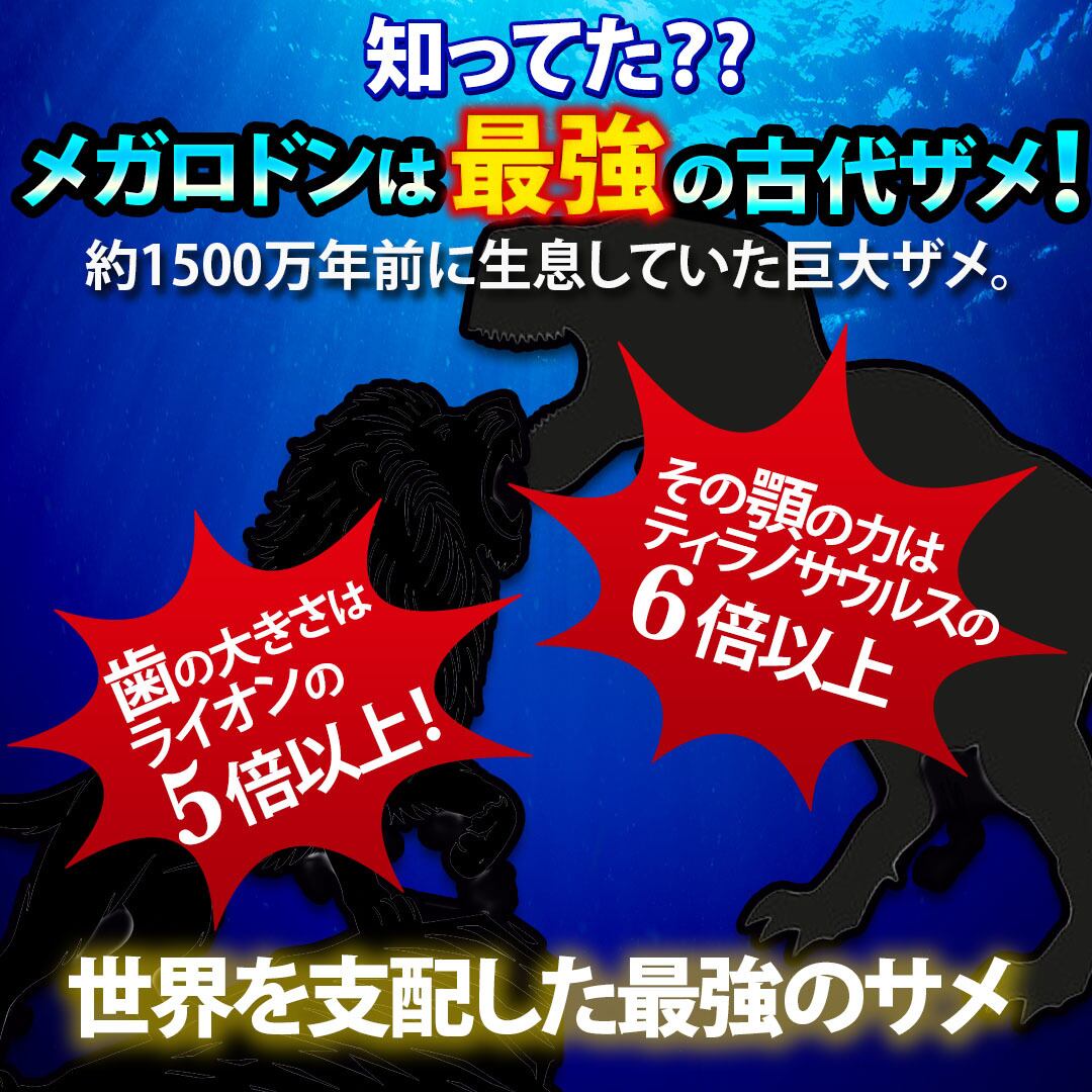 史上最大とされる古代のサメ。標準和名では、「ムカシオオホホジロザメ」と呼ばれ、メガロドンは、現在から200万〜1500万年前に生息していたとされ、世界中で歯の化石が出土しています。歯は現在のホホジロザメよりはるかに大きく、そこから推測される体長は20メートル近くにもなるといわれています