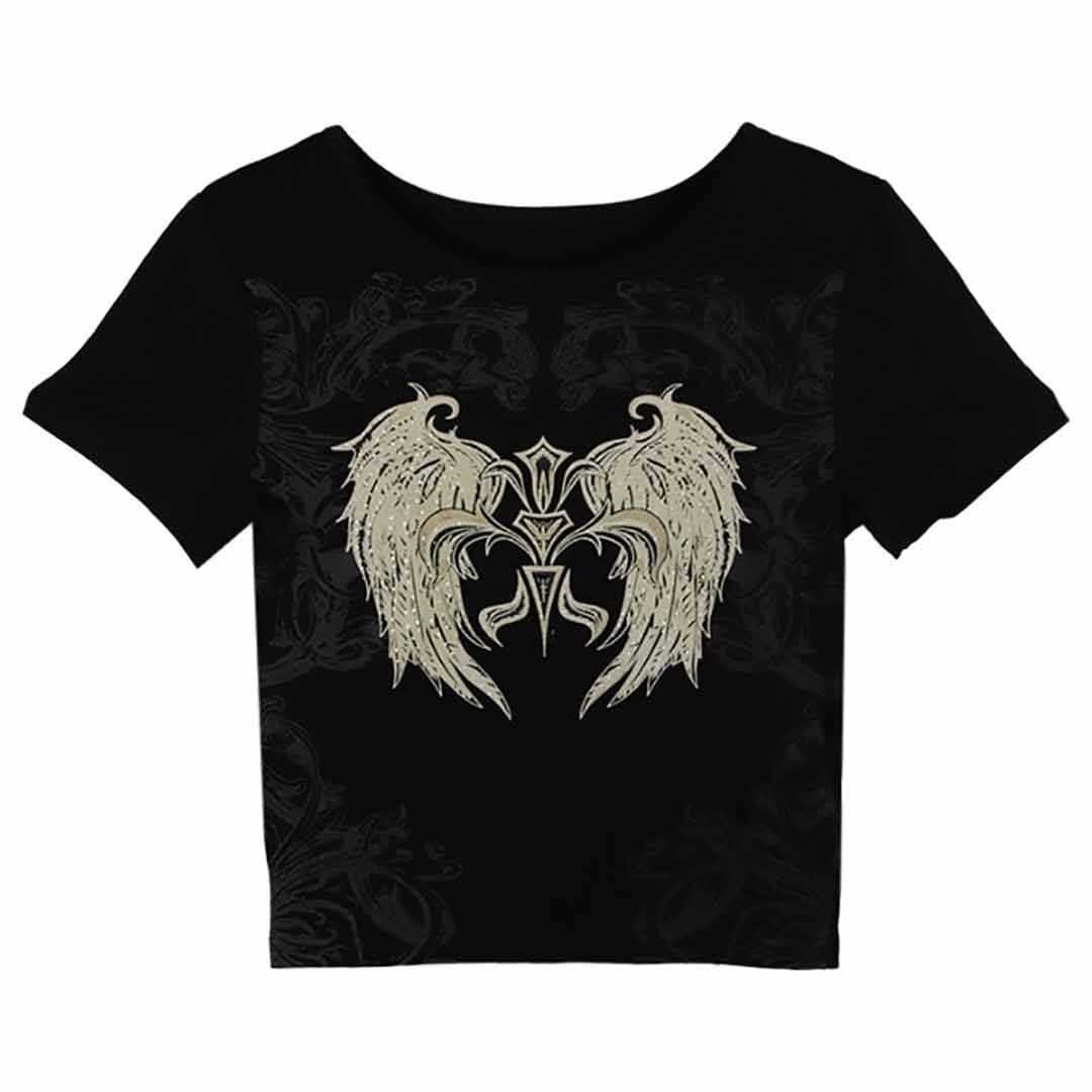 トップス へそ出し 羽根 Mサイズ ブラック Tシャツ ダンス衣装 韓国ファッション ショートトップス レディース 半袖 ステージ衣装 ヒップホップ ストリート ファッション 原宿系 ショート丈 シンプル 黒 オルチャン モード系