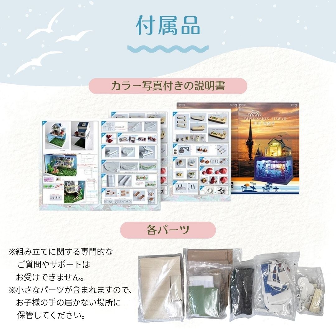 こちらの商品はパーツを組み立てて完成させるDIYタイプ。カラー写真付きの説明書で分かりやすく、手作りならではの達成感が味わえます。完成後はライトを点けることで一気に雰囲気が変わり、夕暮れの海辺で灯りがともるような、温かく心地よい海の家の情景が広がります。