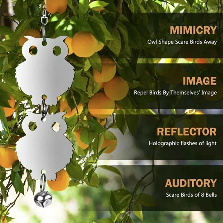防害獣フクロウ反射板は鳥や小動物の侵入を防ぐだけでなく、鳥や動物の高い学習能力を逆手に取り、防止する効果もあります。こちらの商品を取り入れれば、糸やテグスなどで囲いを作るネットなどの作業ではなく、吊り下げるだけですので簡単にできるのが魅力です